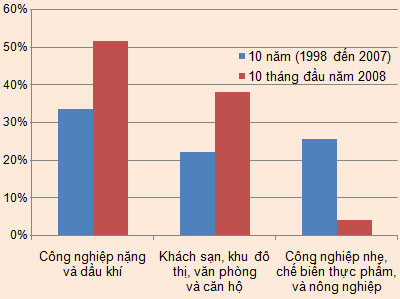 Vì vậy, dễ thấy sự tăng đột biến của các dự án bất động sản. Nếu tính liên quan đến bất động sản là các dự án khách sạn, khu đô thị, văn phòng và căn hộ, thì chỉ riêng trong 10 tháng đầu năm 2008, các dự án loại này đã đạt vốn đăng ký hơn 22 tỷ USD. Để so sánh, trong suốt giai đoạn từ 1998 đến 2007 cũng chỉ có gần 19 tỷ USD đăng ký vào nhóm đầu tư này. Riêng cho nhóm này, vốn đầu tư (đăng ký) trong 10 tháng đã cao hơn cả giai đoạn 10 năm trước!Đầu tư vào công nghiệp chế biến giảm