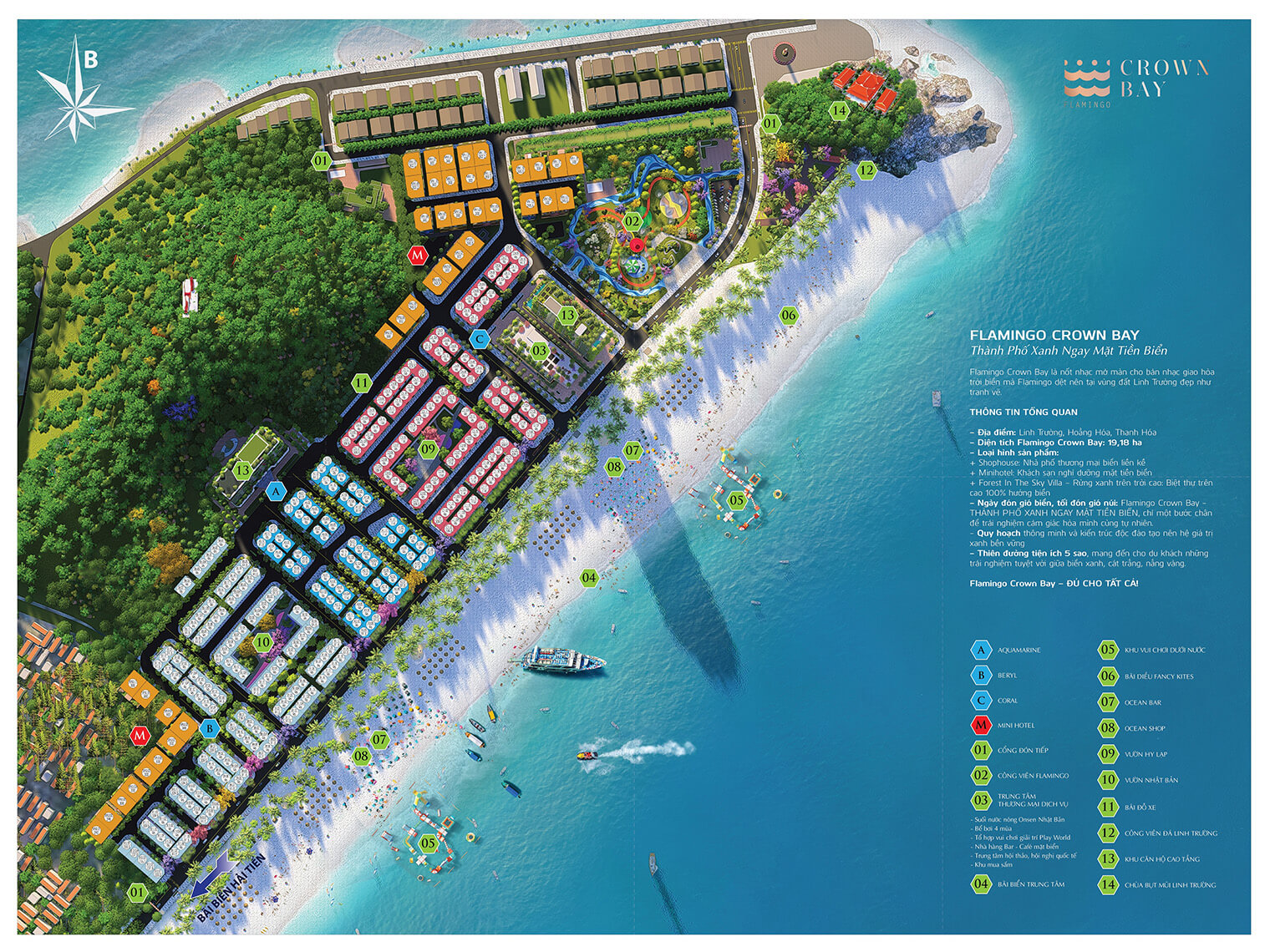 Flamingo Crown Bay Hải Tiến Thanh Hóa tọa lại tại khu đất có diện tích 193,901 m2 với quy hoạch bao gồm 3 phân khu chính: Phân khu Aqua Marina, Phân khu Beryl, Phân khu Coral.