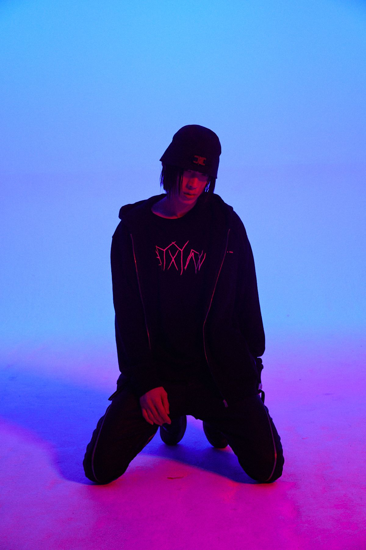 Now he brings his talents to his own line Xyn with a six-piece capsule of edgy, black streetwear separates and a limited edition collaboration with New York label 1017 ALYX 9SM. The idea first came after the latter's spring-summer 2020 show where Xin (a house friend and occasional model for the brand) was approached by founder Matthew M. Williams' daughter Alyx. Xin asked Alyx to scribble their two names together and the idea for "Alyxyn" was born. The clothes also feature thermoresponsive properties, so the graphic on the hoodie and the phone bag change colour when touched.