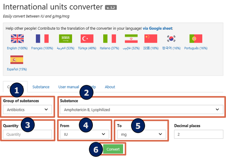 International units converter (between IU and g/mg/mcg) — MY PHARMA TOOLSConverter Substance User manual Help About Group of substances Substance Quantity From To Decimal places Convert