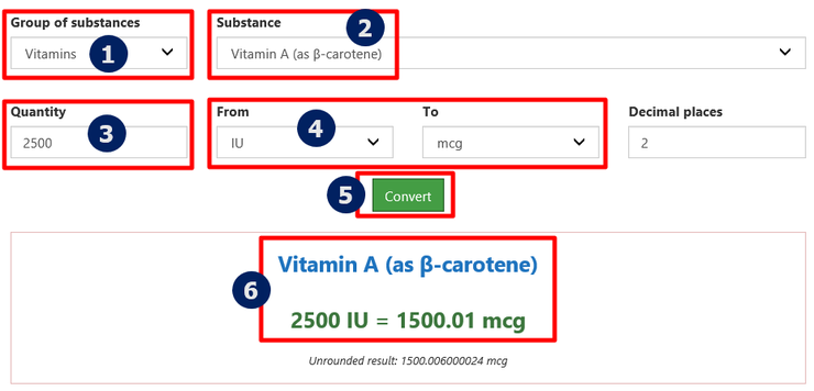 1번에 비타민을 선택, 2번에 vitamin(as β-carotene)를 선택, 3번에 전환하는 양인 2500을 적습니다. 5번 convert를 클릭하면 6번에서 2500 IU = 1500.01mcg 라는것을 알 수 있습니다. IU 단위 환산 방법이 처음에는 어렵지만 해 보면 어렵지가 않아요~~