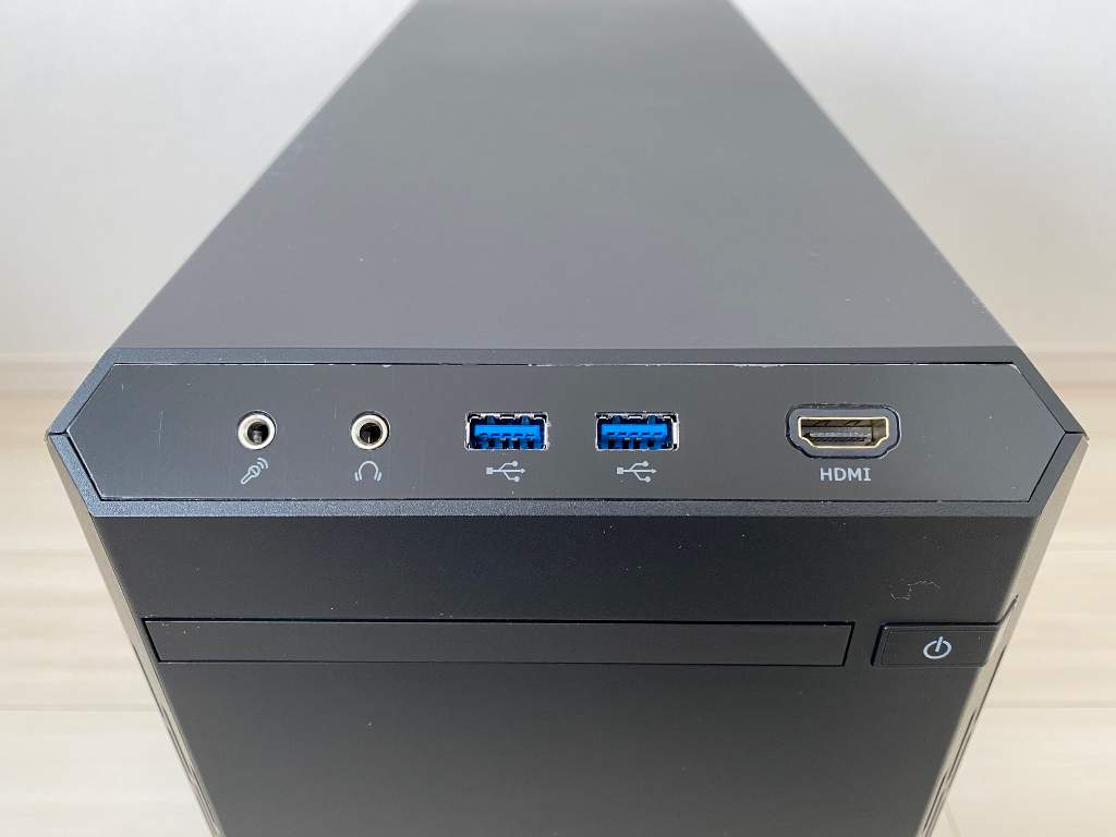 ケースはミニタワーなので狭い場所でも設置しやすく、机の下に設置した場合にフロント上段に配置されたインターフェイスで接続しやすい構造となっています。