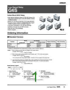 GLow6SigSnal Relay Suface Mount DPDT Relay • High dielectric withstand voltage of 2,000 VAC between coil and contacts (standard type); 1,500 VAC between contacts of different polarity. • Meets FCC Part 68 and Telcordia 2.5 kV surge withstand. • European version certified for EN60950/EN41003 Supple- mentary Insulation at 250 V at Pollution Degree 2. • Low power consumption of 140 mW (Non-latching) • Available in through-hole and SMT terminals. • Tape and reel or tube packaging. • RoHS Compliant. Ordering Information ■ Standard Version . Model Contact form DPDT Non-latching Terminal Gull-wing Single coil latching Dual coil latching Standard G6S-2F European Version* G6S-2F-Y G6S-2G-Y G6S-2-Y G6SU-2F G6SU-2G G6SU-2 G6SK-2F G6SK-2G G6SK-2 Inside “L” G6S-2G G6S-2 PCB through-hole * Certifiedfor EN60950/EN41003 Supplementary Insulation at 250 V (pollution degree 2) Notes: 1. When ordering, add the rated coil voltage to the model number. Example: G6S-2F DC12 Rated coil voltage 2. When ordering tape packing (surface mount models), add"-TR" to the model number. Example: G6S-2F-TR DC12 Tape packing "-TR" is not part of the relay model number. Therefore,it is not marked on the relay case. 3. Dual coil latching models are available with a High-sensitivity coil. (140 mW; 200 mW for DC24) When ordering High-sensitivity dual coil latching models, add "-H” to the model number. Example: G6SK-2G-H-TR DC5 High-sensitivity coil Model Number Legend G6S - - - DC 1 2 3 4 5 6 5. Packaging None: Tube packaging 3. TerminalShape None: Through-hole 1. RelayFunction None: Non-latching TR: Tape and reel packaging U: K: Single coil latching Dual coil latching F: Gull-wing surface mount Inside “L” surface mount (Surface mount models) G: 2. ContactForm 4. ApprovedStandards 6. RatedCoil Voltage 3, 4.5, 5, 12, 24 VDC 2: DPDT None: UL/CSA Y: EN60950/EN41003 (Standard coil models - 5, 12, 24 VDC ) Low Signal RelayG6S 79