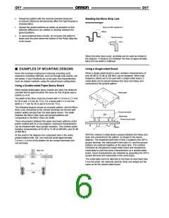 G6Y G6Y • • • Design the pattern with the shortest possible distances. Excessive distances will adversely effect the high-frequency characteristics. Bending the Micro Strip Line Z Spread the ground patterns as widely as possible so that potential differences are unlikely to develop between the ground patterns. To avoid potential short-circuits, do not place the pattern’s leads near the point where the bottom of the Relay attaches to the board. s 45°C When the lines must curve, an elbow can be used as shown in the diagram. A distance (D) between the lines of approximately twice the line width is sufficient. Using a Single-sided Board EXAMPLES OF MOUNTING DESIGNS When a single-sided board is used, isolation characteristics of only 60 dB to 70 dB at 200 MHz can be obtained. When high frequency bands are to be used with a single-sided board, a metal plate can be placed between the base and Relay and connected to the ground pattern. Since this example emphasizes reducing mounting costs, expensive mounting methods, such as through-hole boards, are not shown. If such methods are to be used, the characteristics must be studied carefully, using the actual board configuration. Using a Double-sided Paper Epoxy Board When double-sided paper epoxy boards are used, the dielectric constant will be approximately the same as that of glass epoxy Metal plate boards (ε =4.8). r The width of the Strip Lines for a board with t=1.6 mm is 2.7 mm for 50 Ω and 1.8 mm for 75 Ω. For a board with t=1.0 mm the width is 1.7 mm for 50 Ω and 0.8 mm for 75 Ω. The following diagram shows an example pattern, and the Micro Strip Lines connected to the contact terminals are formed with pattern widths derived from the description above. The width between the Micro Strip Lines and ground patterns are comparable to the Micro Strip Line width. Ground terminals G6Y Metal plate Printed circuit board There are jumpers between the upper and lower patterns at the points marked with Xs in the diagram. Improved characteristics can be obtained with more jumper locations. This method yields isolation characteristics of 65 dB to 75 dB at 500 MHz and 50 dB at 900 MHz. Pattern With this method a metal plate is placed between the Relay and base and connected to the pattern, as shown in the above diagram. The important point here is that 3 locations (the G6Y’s ground terminal, the metal plate’s bent tabs (A), and the ground pattern) are soldered together at the same time. This method combines an inexpensive single-sided board and inexpensive metal plate to yield the same characteristics as a double-sided board. Good characteristics are obtained by grounding the G6Y’s ground terminal and metal plate in the same place. At this point in the diagram the component side is the entire ground pattern side; but, you must set aside approximately 2.0 mm × 2.0 mm of the pattern for the contact terminals and coil terminals. Strip Line The metal plate must be attached to the base as described here. From this point, the methods used for Strip Line design are the same as for the double-sided board. G6Y Coil