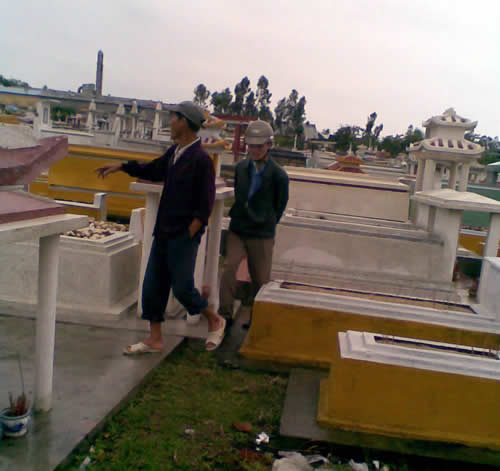 Xong phần viếng mộ, tôi rời khỏi đoàn dạo quanh khu đất gần đó với ý định tìm hiểu thêm về vấn nạn mồi chài khó coi tại khu nghĩa trang này thì lập tức bị nhóm “cò” bám đuôi. Tôi bảo có nhu cầu mua đất mộ tại khu cán bộ, một tay “cò” đại diện ra giá ngay: 200.000 đồng/m2 (bình thường một phần đất mộ khoảng 15-20m2). Xây trọn gói, giá 14-16 triệu đồng/mộ, tùy theo vật liệu khách hàng chọn là đá ga-nít hay đá ga-tô.