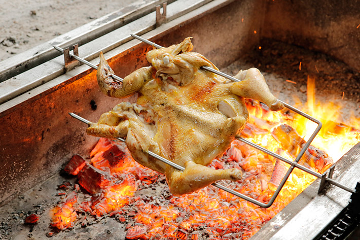 Gà để chế biến món ăn phải là loại gà ta thả vườn để có chất lượng thịt tốt nhất. Gà ta thịt chắc, dai, ngọt, thơm sẽ cho ra món ăn có hương vị tuyệt ngon. Sau khi làm sạch, gà được tẩm ướp thấm đẫm gia vị trong khoảng 20- 30 phút mới đem đi quay trực tiếp trên than hồng. Các gia vị được đầu bếp của Ẩm thực Dzui Dzui ướp theo đúng công thức của người dân Kampot giúp làm nổi bật hương vị thơm ngon của gà ta, vị đậm cay của tiêu và nước mắm, cùng vị thanh ngọt của mật ong.