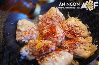| | Bước 3: Cho 1 muỗng cà phê ớt bột (mình dùng ớt bột không cay để lấy màu), nước đường và nước tương vào chảo gà, gia giảm gia vị tùy khẩu vị. Nếu nêm nước tương mà vẫn thấy chưa được mặn thì có thể nêm thêm tí muối hoặc hạt nêm, đừng nêm chỉ một mình nước tương thôi vì nhiều nước tương quá sẽ làm món gà rất sậm màu. |