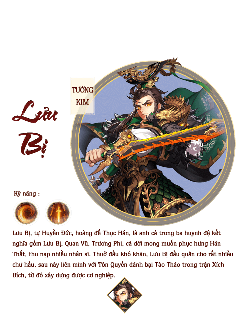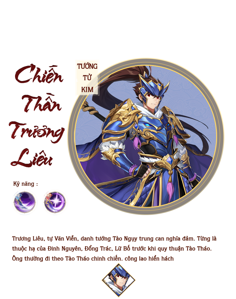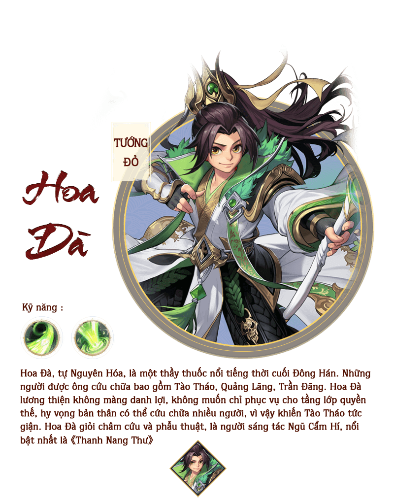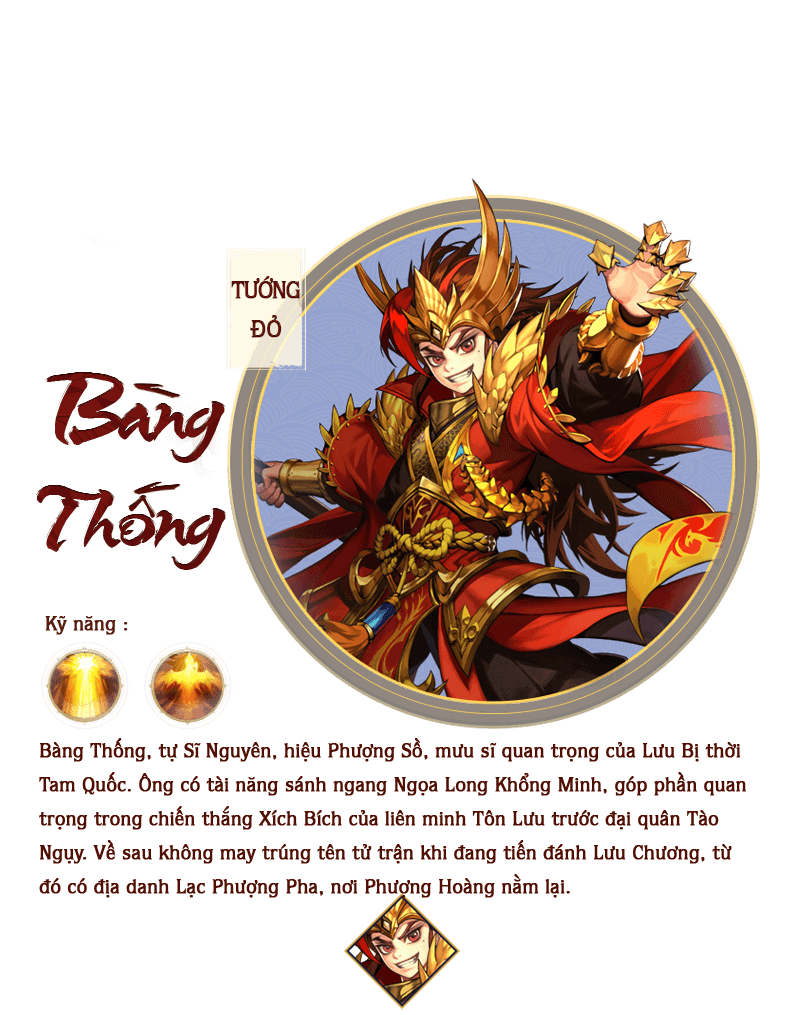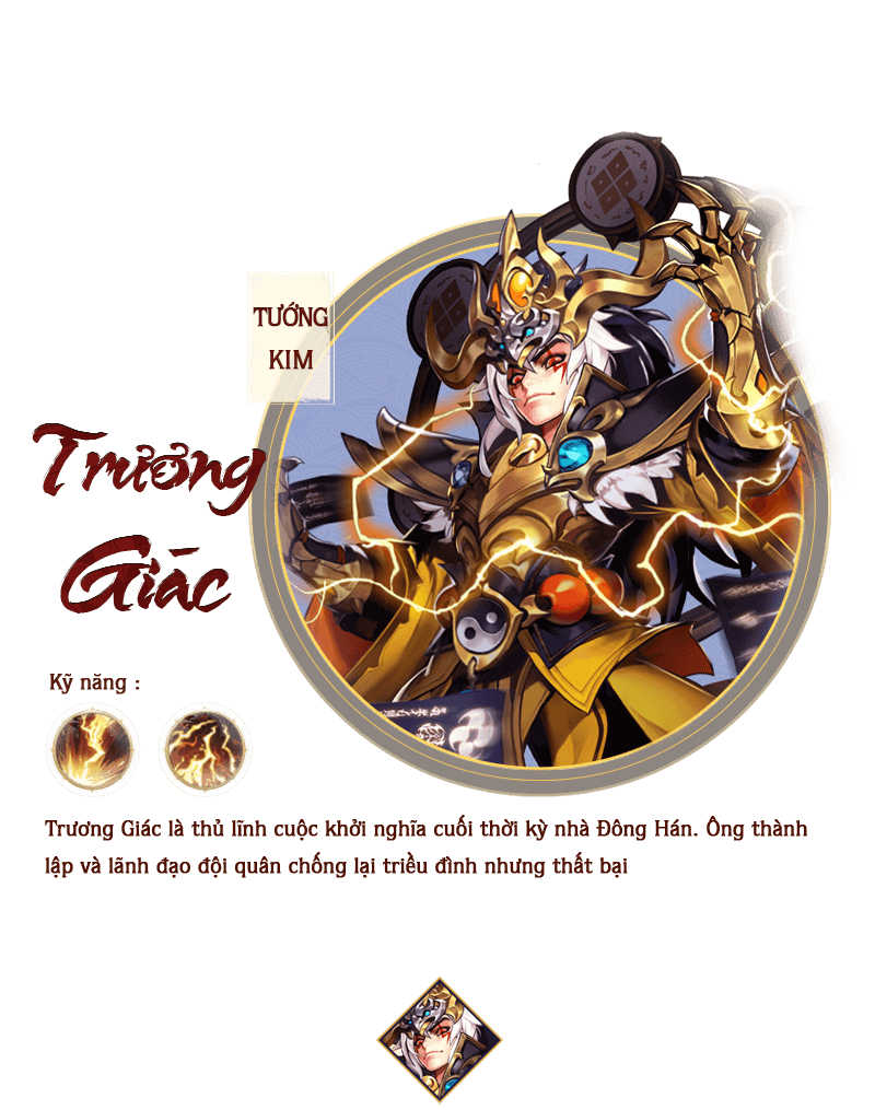 Trị liệu cho cả phe ta (107%+700), làm bạo kích mục tiêu tăng 10%, trong 2 hiệp. Đồng thời 1 đơn vị phe ta bạo kích tăng 15%, trong 2 lượt