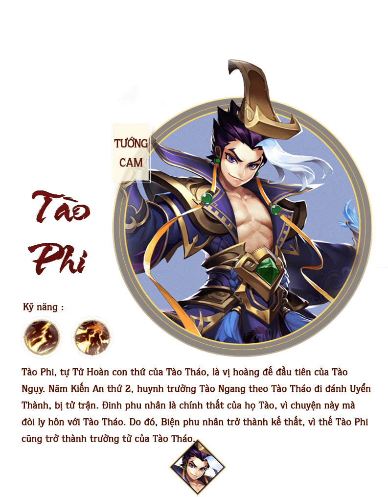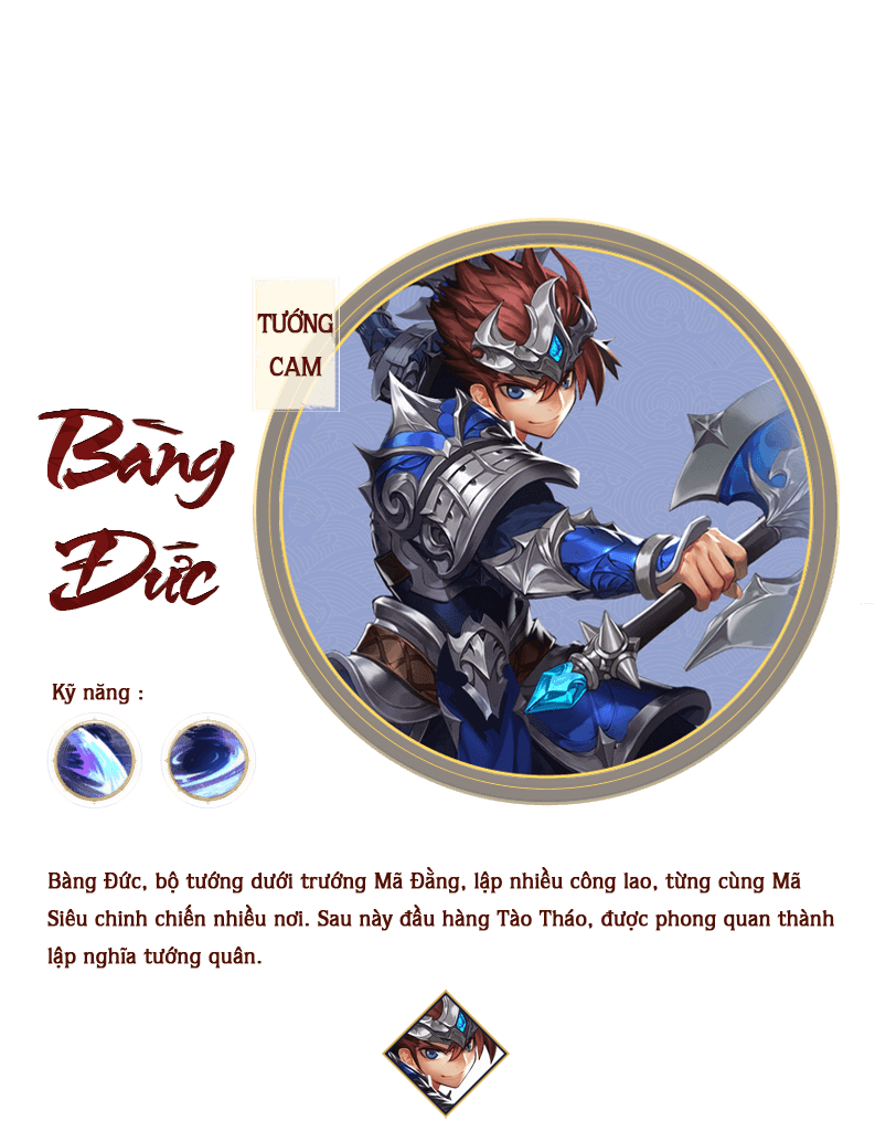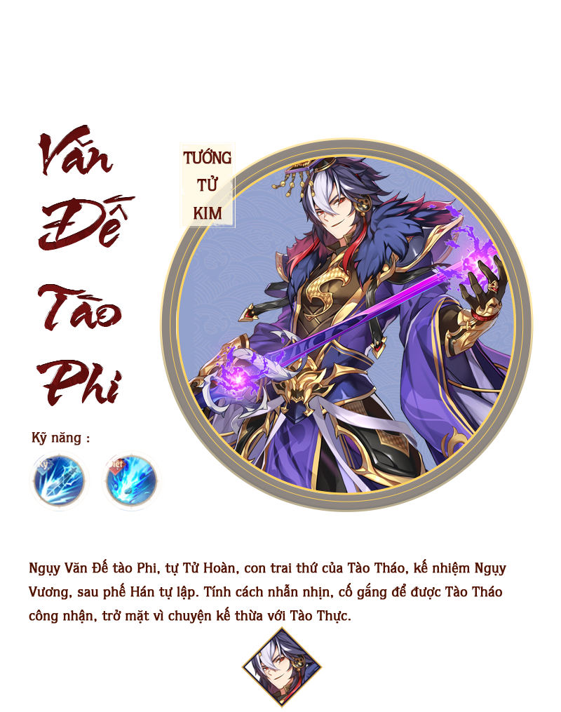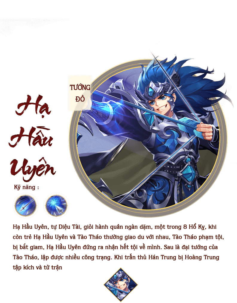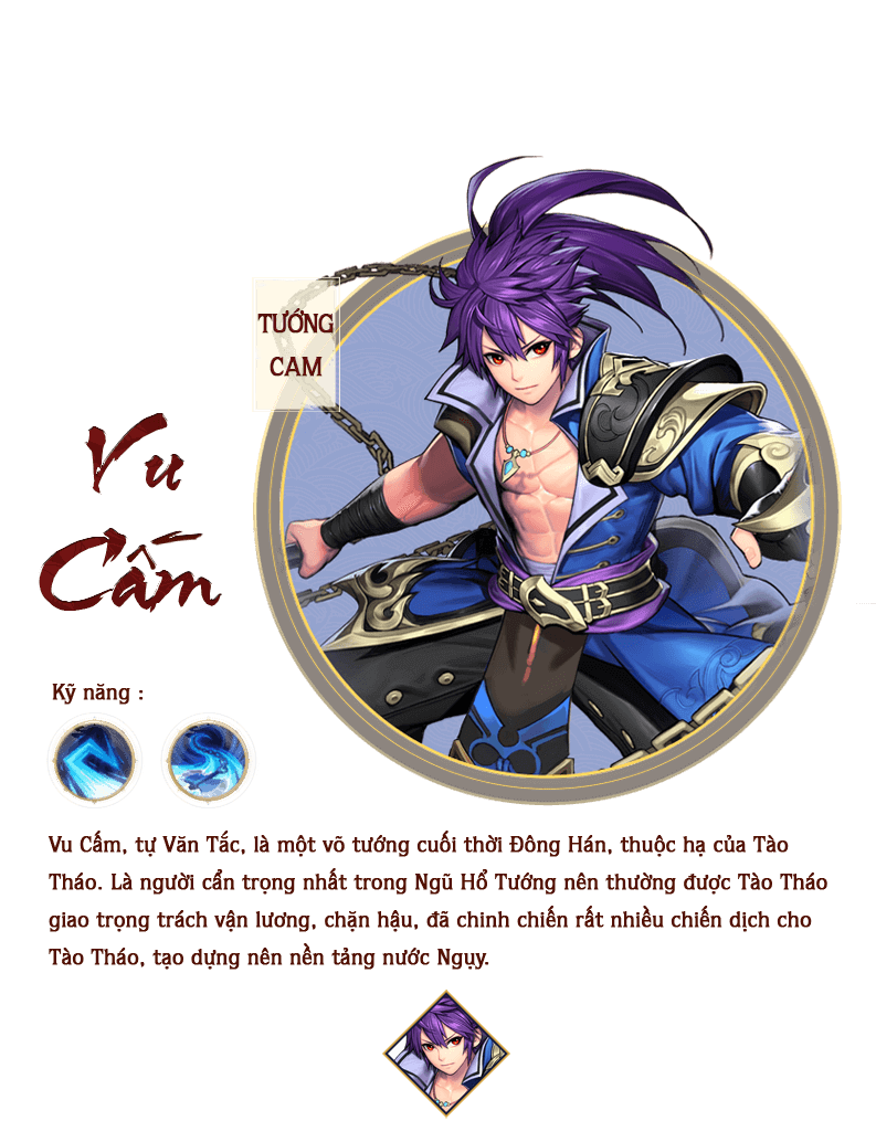 Khiến 1 kẻ địch chịu 650% sát thương vật lý, lần này tấn công bỏ qua của mục tiêu 40% phòng thủ, gây hiệu quả [Nghiền Nát]. Đồng thời tăng cho toàn bộ phe ta chính xác 20%, duy trì 2 hiệp. Nếu phe ta cùng lúc ra trận 3 Võ Tướng Ngụy trở lên, đầu trận kích hoạt hiệu quả [Chiến Trận Ngụy].