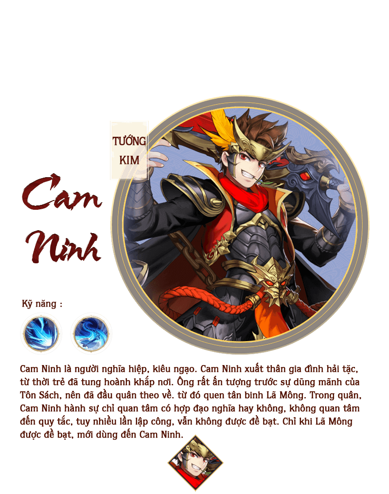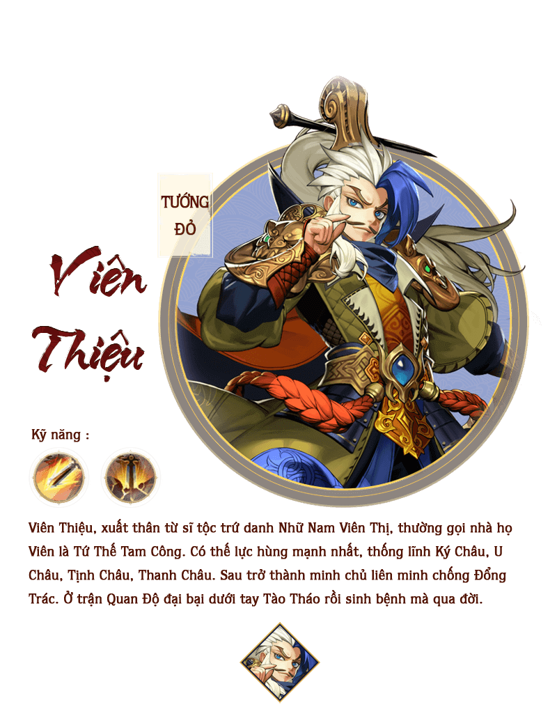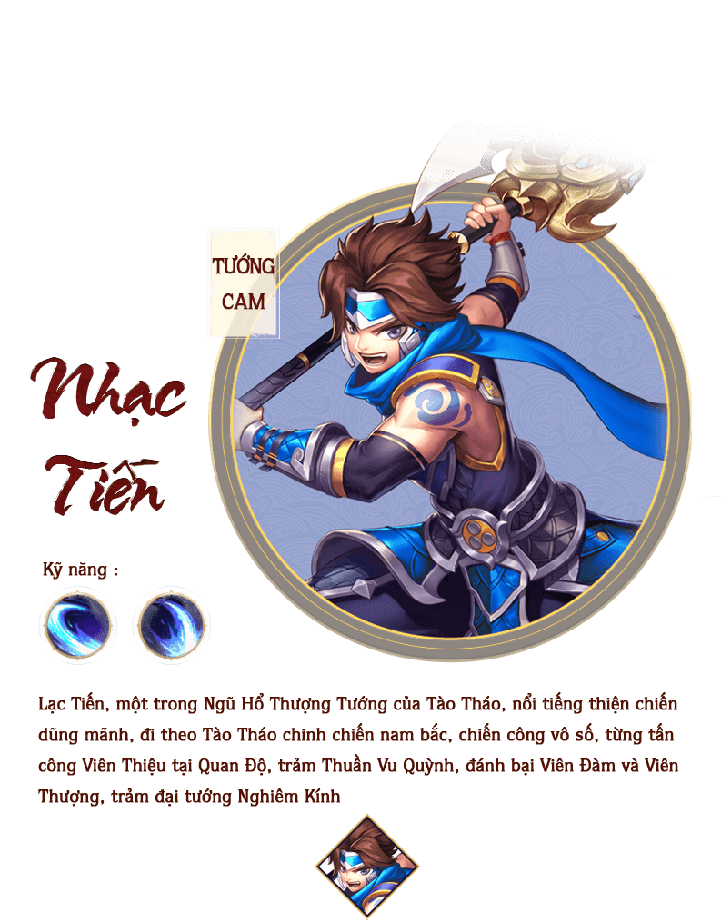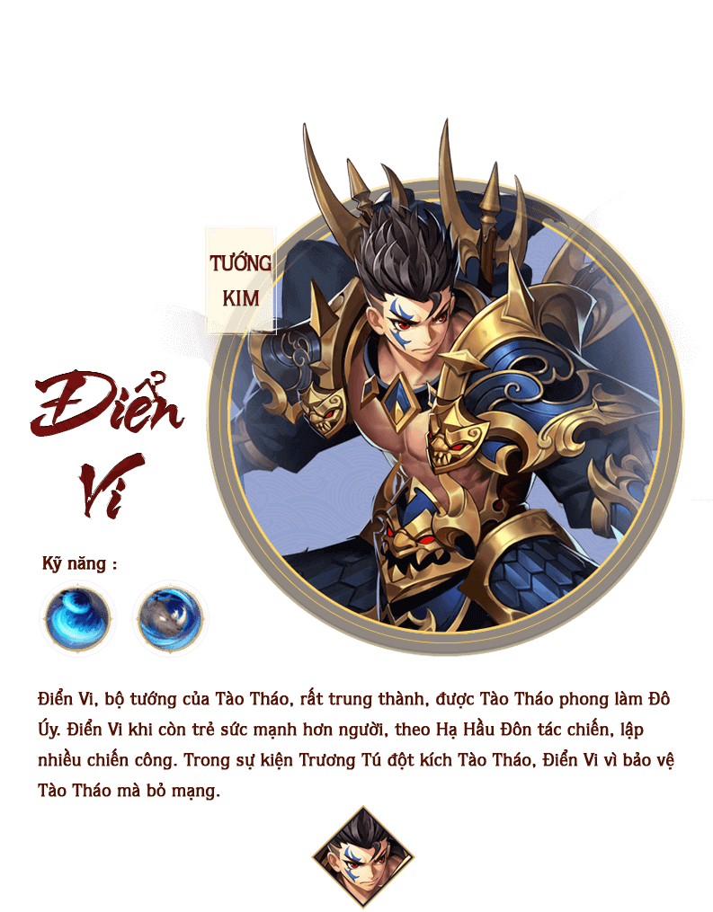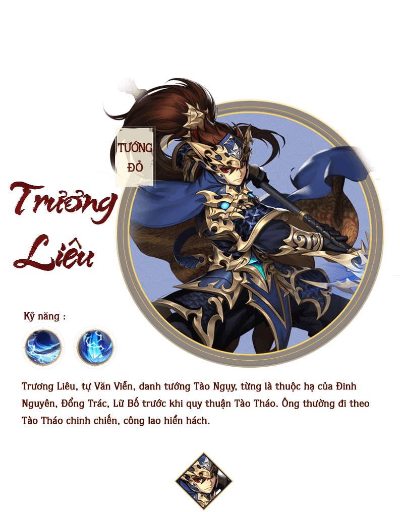 Khiến 1 kẻ địch chịu 650% sát thương vật lý, lần này tấn công bỏ qua của mục tiêu 40% phòng thủ, gây hiệu quả [Nghiền Nát]. Đồng thời tăng cho toàn bộ phe ta chính xác 20%, duy trì 2 hiệp. Nếu phe ta cùng lúc ra trận 3 Võ Tướng Ngụy trở lên, đầu trận kích hoạt hiệu quả [Chiến Trận Ngụy].