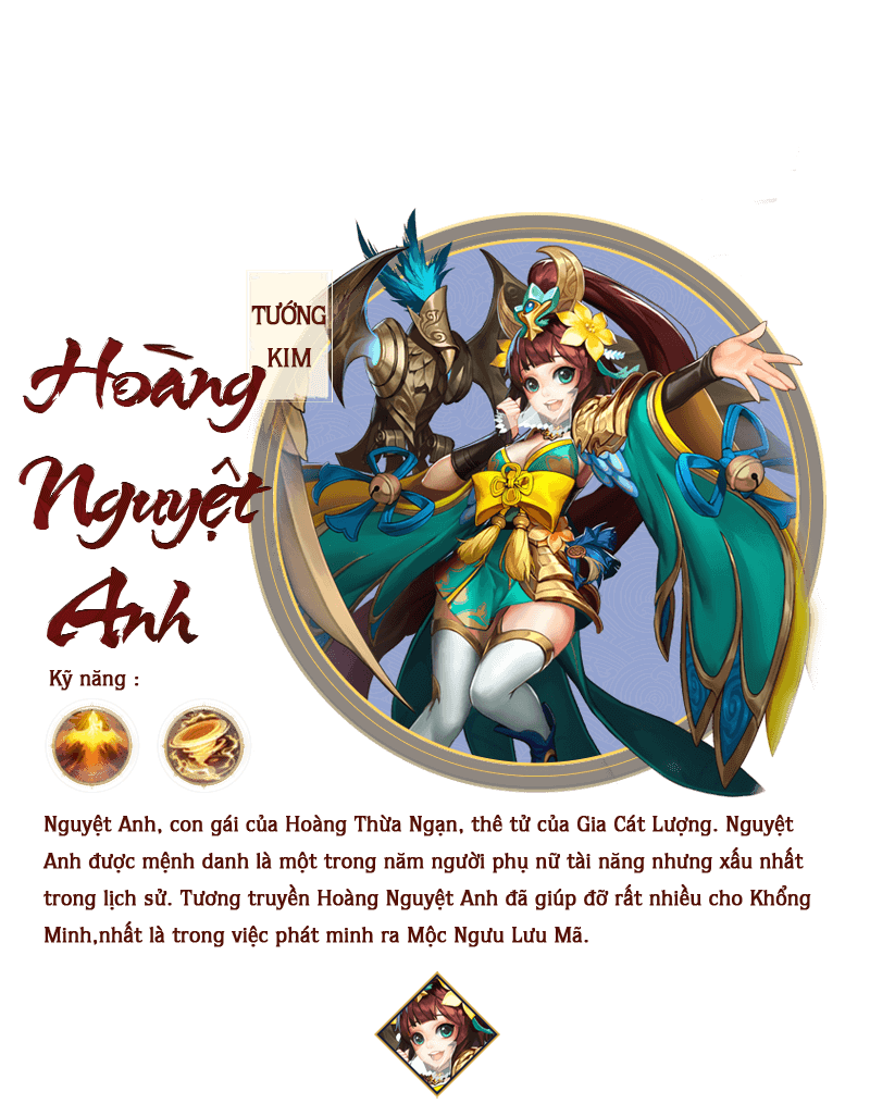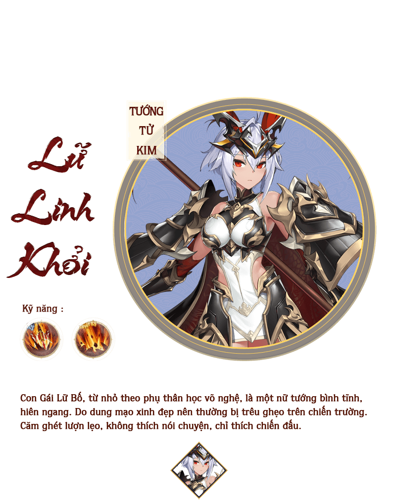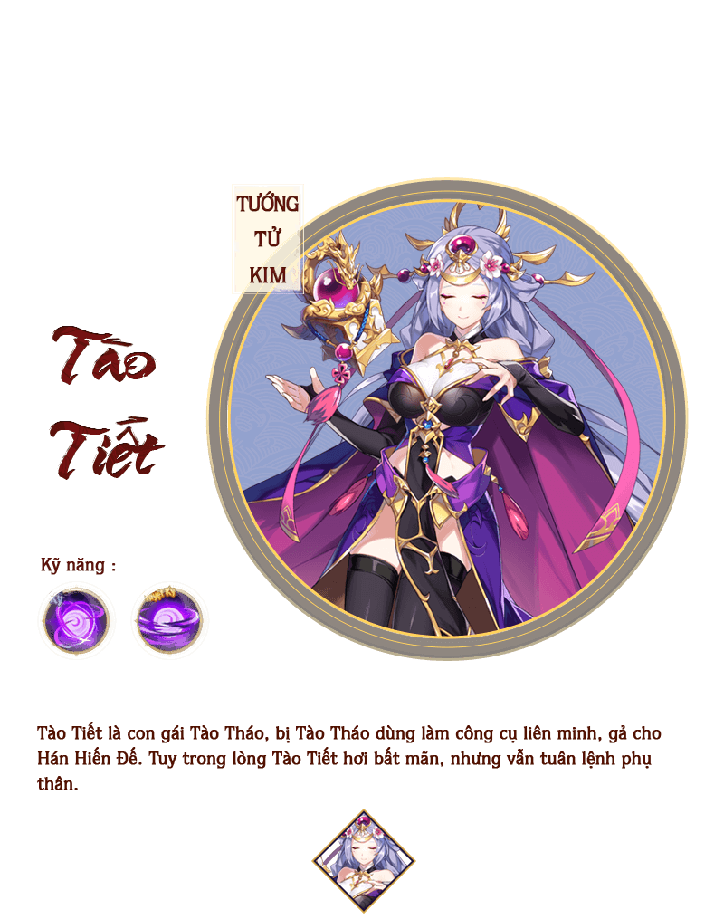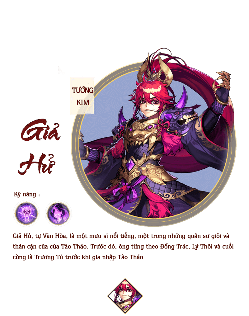 Gây 241% ST phép hàng trước, có tỉ lệ giảm ST và bạo kích, trong 2 hiệp. Có thể khiến mục tiêu trừ 5% SL/lượt) trong 2 hiệp. Gây thêm 250% ST phép cho địch có ít hơn 4 Nộ.