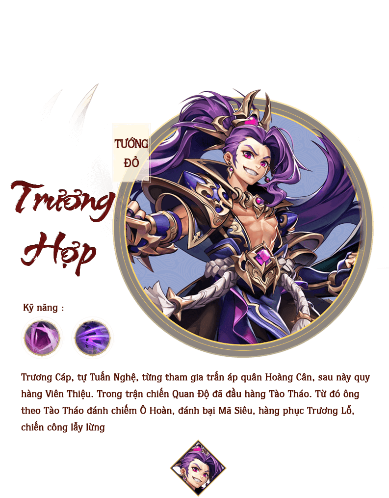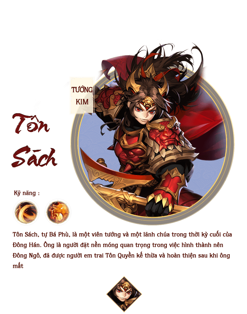 Khiến kẻ địch hàng sau chịu 418% sát thương vật lý, gây cho địch hiệu quả 【Tập Kích】, nếu sinh lực bản thân thấp hơn mục tiêu, tăng 25% sát thương, chuyển hóa 50% sát thương gây ra thành sinh lực bản thân. Khi thi triển kỹ năng, giúp toàn bộ phe ta tăng sát thương 25%, duy trì 2 hiệp.