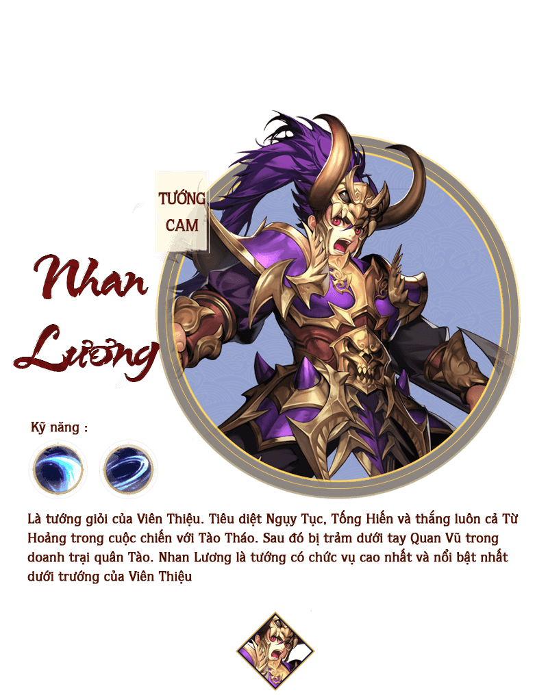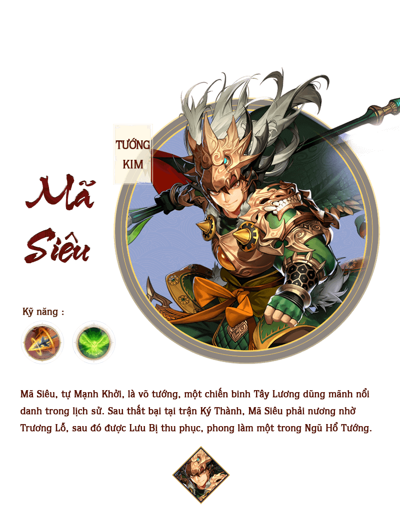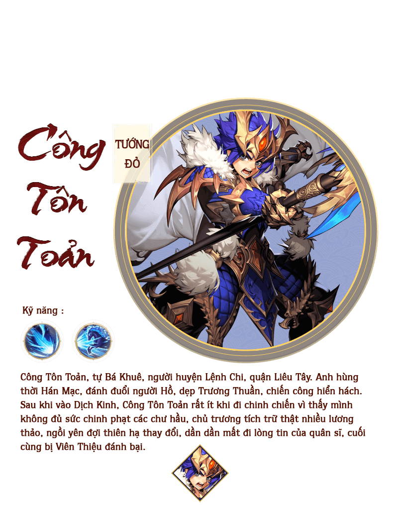 Khiến mục tiêu và đơn vị kế bên chịu 323% sát thương vật lý, lần tấn công này có 30% chính xác thêm. Nếu sinh lực mục tiêu trên 50%, gây thêm 150% sát thương vật lý. Tăng sát thương của toàn bộ địch giảm 20%, duy trì 2 hiệp. Sau khi thi triển kỹ năng có 50% phát động thêm 1 lần Đột Kích. [Đột Kích] khiến mục tiêu và đơn vị kế bên 150% sát thương vật lý, sát thương này có 30% gây sát thương x2, đồng thời có 20% hồi cho bản thân 2 điểm nộ khí, có thể kích hoạt hiệu quả Thần Binh).