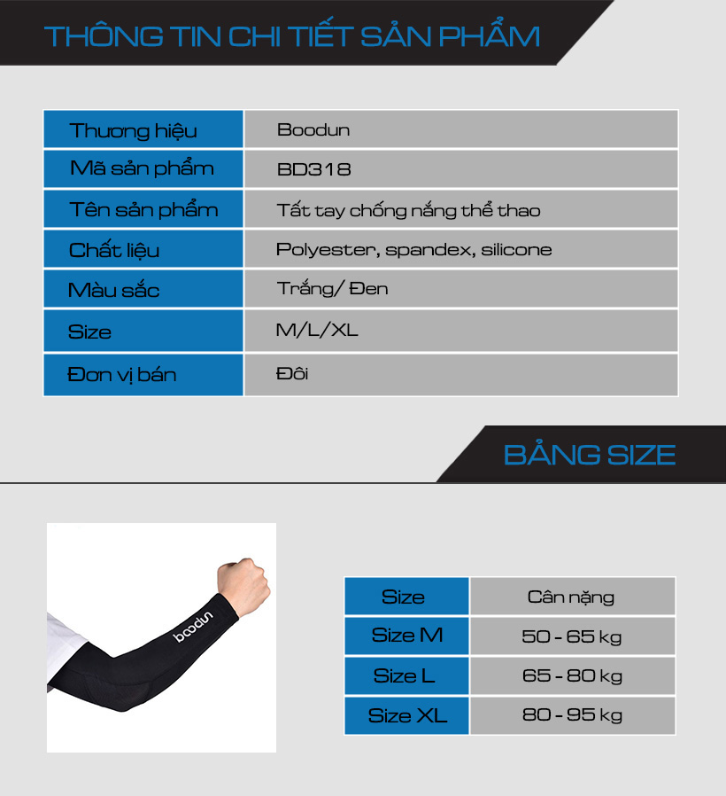Khí hậu trái đất ngày càng nóng lên, lượng tia cực tím từ mặt trời chiếu xuống trái đất ngày càng nhiều ảnh hưởng đến tình trạng da và sức khỏe của con người như gây bệnh ung thư da, cháy và đen da nhất là đối với những người đạp xe đường dài hay chạy marathon.Mặc áo dài đạp xe hay chạy bộ gây vướng víu, khó chịu ảnh hưởng đến quá trình thi đấu hay tập luyện chạy của bạn.Tất tay găng tay chống nắng thể thao, đạp xe, chạy bộ Boodun BD318 là công cụ được lựa chọn nhiều bảo vệ cánh tay của bạn không phải tiếp xúc trực tiếp với ánh sáng mặt trời, đặc biệt là các tia tử ngoại với thành phần UVA/UVB cho ngày hè oi ả, khi mà chúng ta phải di chuyển ngoài trời nhiều.