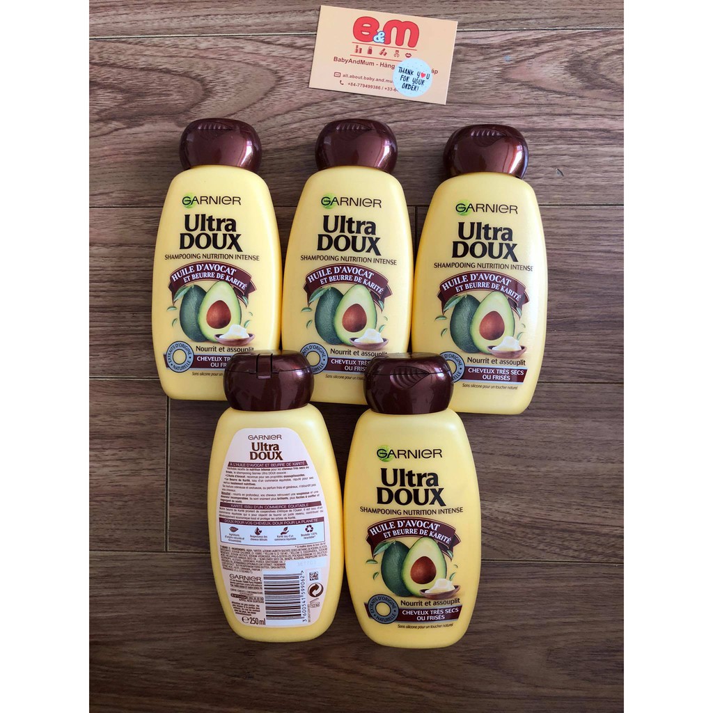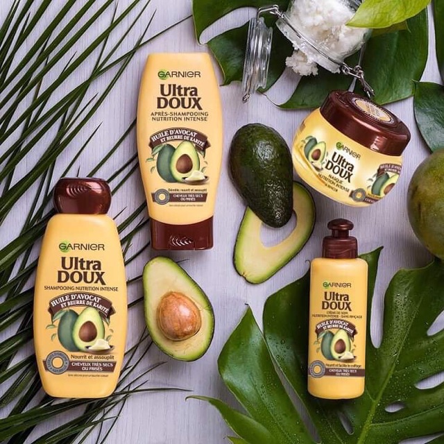 - Cùng với dầu xả và kem ủ tóc, dầu gội Garnier Ultra Doux tinh chất bơ tạo nên một bộ sản phẩm chăm sóc tóc chuyên sâu.
