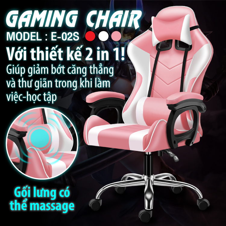 Để đáp ứng, phục vụ tốt các vấn đề của dân văn phòng đang gặp phải, Ghế gaming,văn phòng cao cấp dành cho game thủ model E02-S có tích hợp các tính năng như ngả lưng sâu, tựa đầu,…đặt biệt sự cải tiến về thiết kế gối tựa lưng-Massage mới với 2in1 nhằm đáp ứng tốt nhu cầu nghỉ trưa, thư giãn không chỉ dành cho dân văn phòng làm việc mà còn học tập giúp mang lại những công dụng tuyệt vời dành cho sức khỏe của bạn.