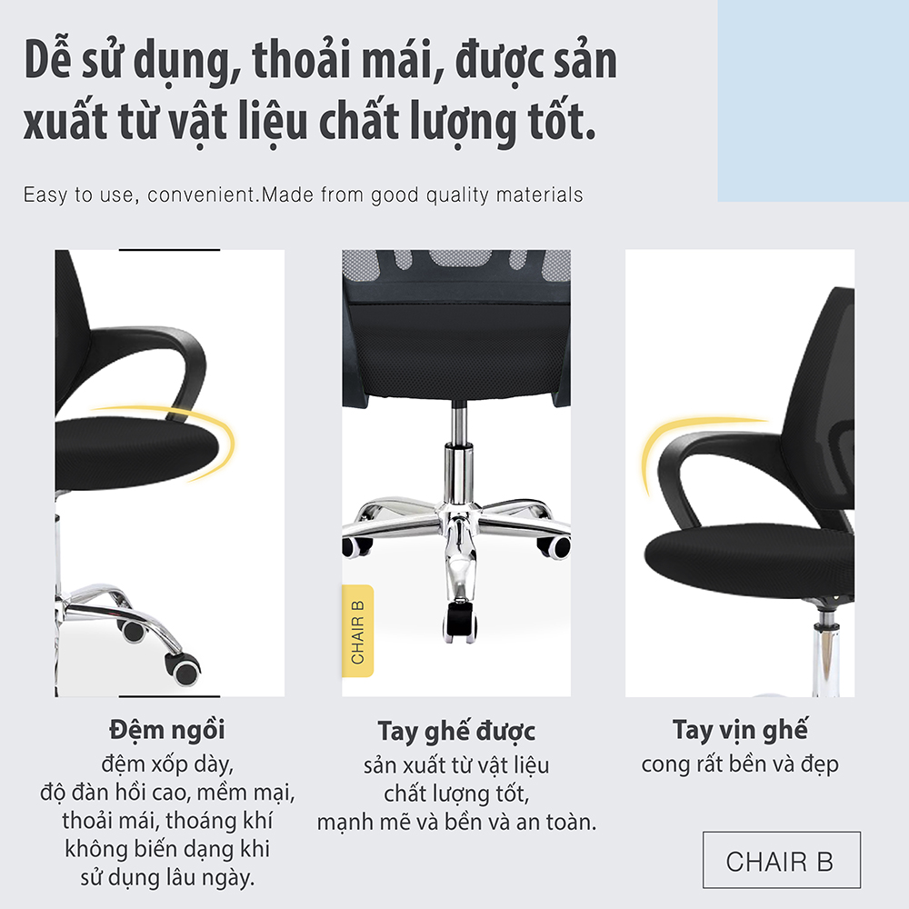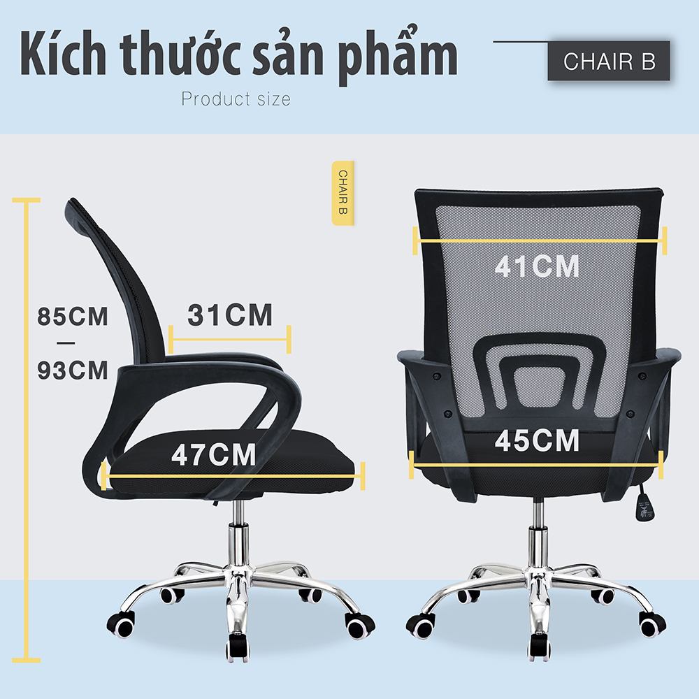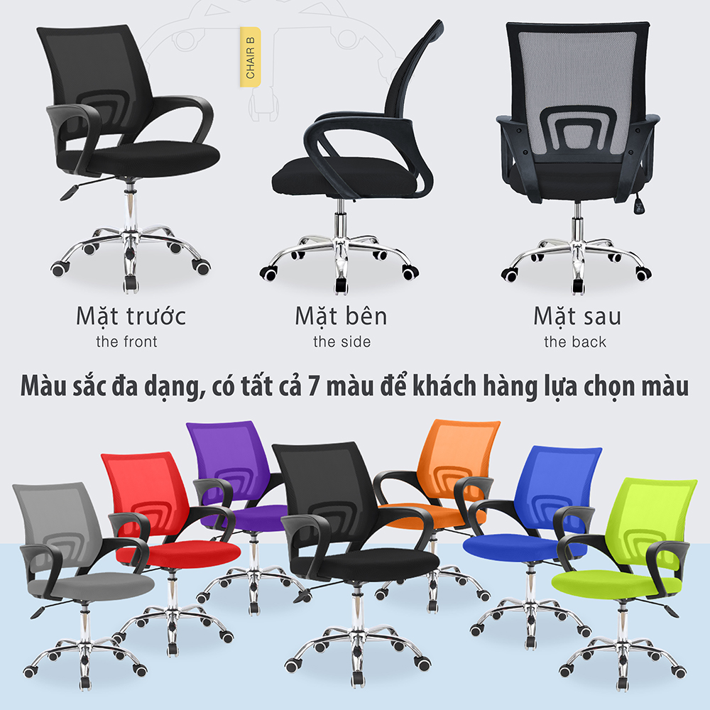 Chất liệu vải lưới thoáng khí đàn hồi, dễ chăm sóc giặt giũ, giúp chống tích nhiệt, cân bằng trọng lượng cơ thể và giảm thiểu các triệu chứng nhức mỏi do phải ngồi lâu trong môi trường làm việc.