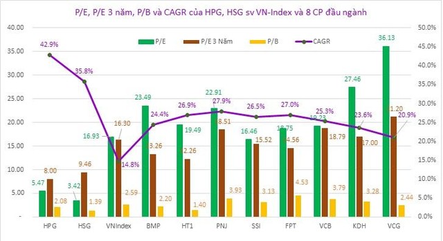 So với bình quân ngành tài nguyên cơ bản (thép) P/E 3 năm gần nhất theo FiinGroup là 12,5 lần, P/E của HPG thấp hơn là 1,29 lần và HSG thấp hơn 2,65 lần còn nếu so với P/E bình quân của VNIndex là 16,93 lần nó thấp hơn 3,95 lần. Nếu so với 8 cổ phiếu hàng đầu của các ngành tiềm năng, HPG và HSG thấp hơn từ 3,2-5,7 lần.