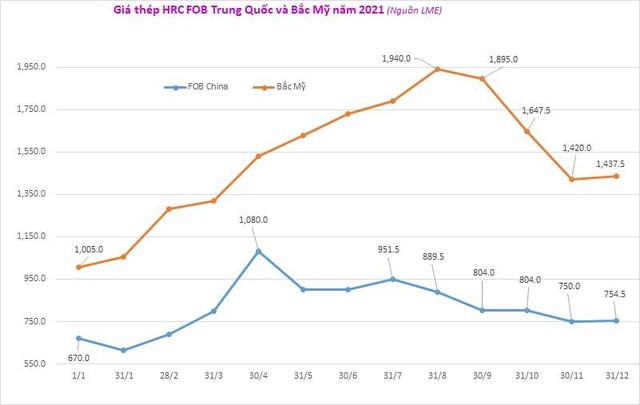 Giá thép HRC FOB TQ đầu năm 2021 là 670 USD/tấn tăng 61,2% lên đỉnh 1.080 USD/tấn vào đầu tháng 5 và sau đó dần đi xuống, đến 31/12/2022 giá là 754.5 USD/tấn, tức giảm 30,1% so với đỉnh cao nhất.