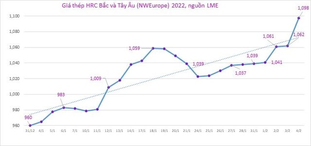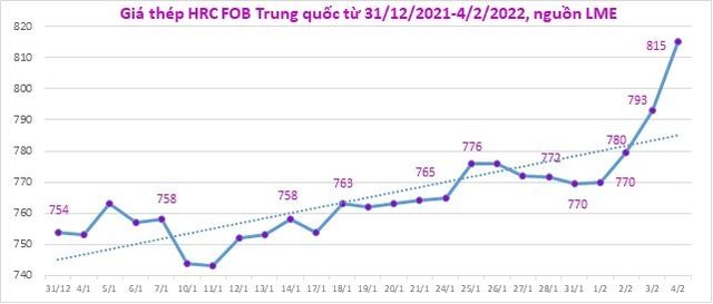 Theo LME (London Metal Exchange) từ 1/1 đến 4/2/2022, giá thép HRC FOB Trung Quốc đã tăng 8,1% từ 754 USD/tấn lên 815 USD/tấn, xu hướng tăng giá rất rõ ràng như biểu đồ dưới.