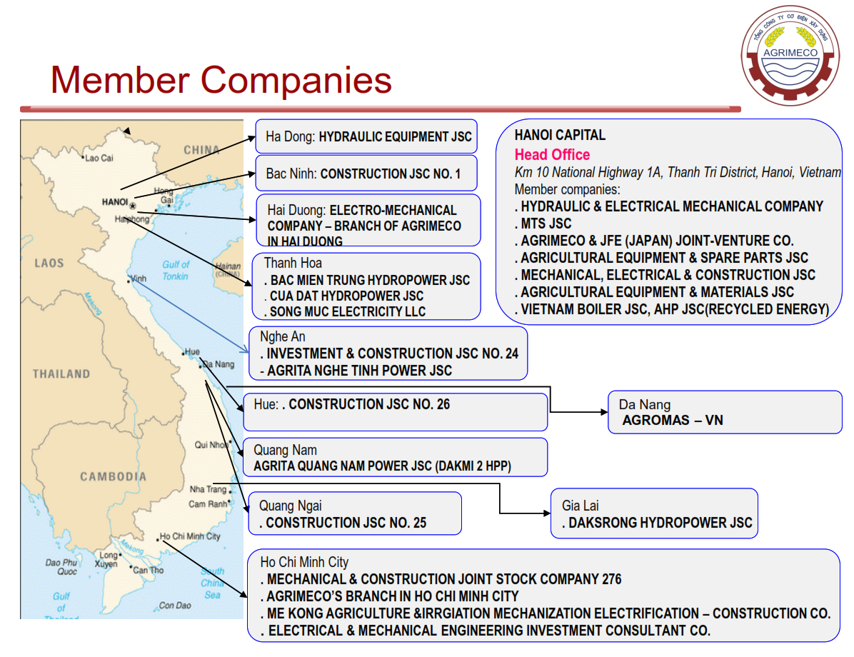 Mechanization Electrification Construction Corporation – JSC formally was Agriculture & Irrigation Mechanization and Electrification Corporation and founded in 1996 on the basis of merging Agriculture and irrigation mechanical engineering companies, specialized in manufacturing machinery and equipment for the agriculture and irrigation sector. In 2003, two specialized corporations of the Ministry of Agriculture and Rural Development, namely the Agriculture & Irrigation Mechanization and Electrification Corporation and Irrigation Engineering Corporation No. 1, were merged into the Agriculture & Irrigation Mechanization - Electrification and Construction Corporation (AGRIMECO). The move aims to set up an efficient corporation that is capable to carry out major projects of national and international scale. Meanwhile, the merger is expected to play a leading role in conducting political missions set by the MARD. In accordance with Decision No. 1580/QĐ-BNN-DNNN dated June 14, 2010, issued by the Minister of the Ministry of Agriculture and Rural Development on approving the Project of converting the existing business model of the Agriculture and Irrigation Mechanization Electrification Construction Corporation (AGRIMECO) to the model of Parent Company - Subsidiaries and converting the Parent Company to One Member Limited Liability Company. Implementing the Decision No. 202/QĐ-TTg dated January 22, 2013, issued by the Prime Minister on approving the plan of AGRIMECO, and the Decree No. 01/2013/NQ-ĐHĐCĐ dated April 25, 2013, issued at the first General Assembly of Shareholders on the establishment of Mechanization Electrification Construction Corporation - Joint Stock Company. The corporation has 20 member companies that employ roughly 10,000 staff, including over 7,000 qualified workers and hundreds of skilled and experienced engineers, doctors, and technicians.