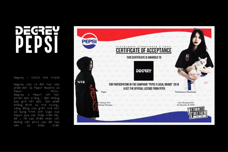 Không còn xa lạ gì với Degrey – một local brand nổi tiếng với những sản phẩm phong phú về kiểu dáng và thiết kế lạ mắt. Với chương trình hợp tác cùng Pepsi, Degrey muốn gửi một thông điệp nhỏ qua bộ sưu tập: “Mình muốn pha màu sắc Á Đông của Degrey kết hợp cùng một thương hiệu bắt nguồn từ châu Âu. Nên các sản phẩm trong bộ sưu tập lần này mang trong mình một điều đặc biệt và mới mẻ”......