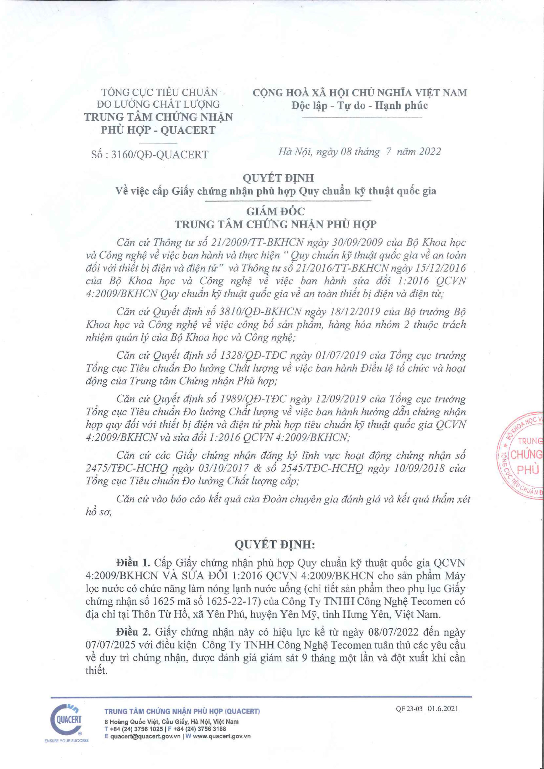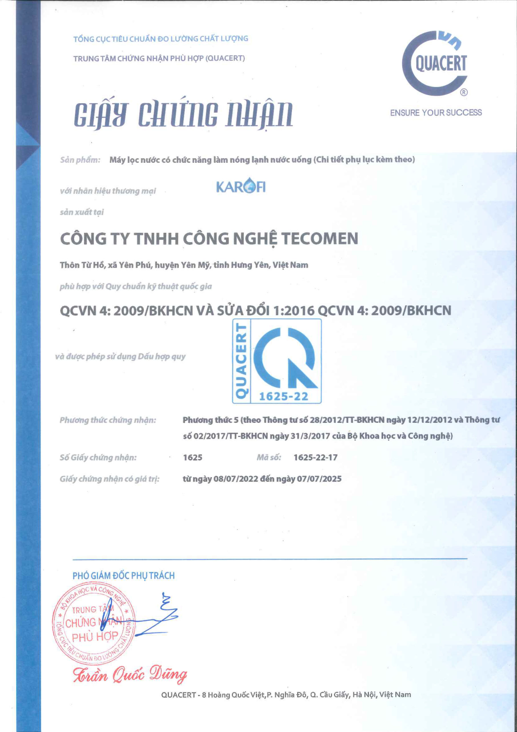 Đạt chứng nhận của Viện Sức khỏe nghề nghiệp và Môi trường – Bộ Y tế về Quy chuẩn quốc gia đối với nước uống trực tiếp.