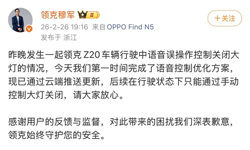 Lynk & Co moves swiftly to fix voice-controlled lighting issue; China's vehicle industry seeks tighter safety boundaries and engineering validation