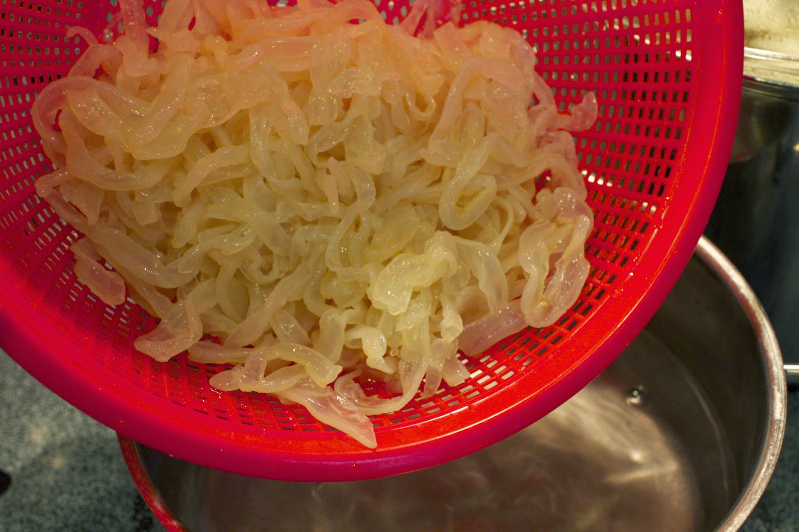 Loại sứa này ngâm trong dung dịch nước muối trong bịt. Rửa sạch ngâm nước lạnh chừng 15 phu´t. Trụng sứa chừng 10 giây trong nước 70 độ thì vớt ra.