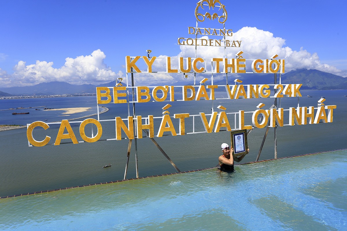 Nói đến Golden Bay Hotel 5* Đà Nẵng, không thể không nhắc đến Hồ bơi vô cực dát vàng 24K cao nhất và lớn nhất thế giới. Tọa lạc tại tầng 29, bể bơi vô cực dát vàng 24K với thiết kế đặc biệt lấy cảm hứng từ sự vô tận của trời biển hứa hẹn sẽ đem lại trải nghiệm mới lạ dành cho bạn. Quý khách có thể ngâm mình trong làn nước mát lạnh, ngắm toàn cảnh thành phố Đà Nẵng xinh đẹp, tắm nắng hoặc đắm chìm trong cảnh hoàng hôn rực rỡ trong khi thưởng thức những món ăn nhẹ và thức uống hấp dẫn tại quầy Bar của khách sạn Golden Bay Hotel 5* Đà Nẵng (chỉ dành cho khách lưu trú tại khách sạn).