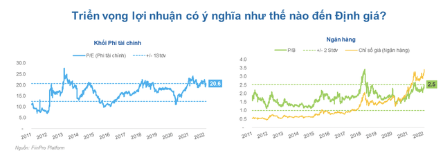 “Định giá của thị trường chịu ảnh hưởng lớn bởi khối ngân hàng. Hiện các ngân hàng niêm yết chiếm khoảng 1/3 lợi nhuận cũng như vốn hóa trong các tính toán về định giá cho thị trường. Tuy nhiên, do đặc thù ngành, P/B là chỉ số hợp lý hơn để định giá cổ phiếu ngân hàng thay vì P/E”, chuyên gia của FiinGroup lưu ý.