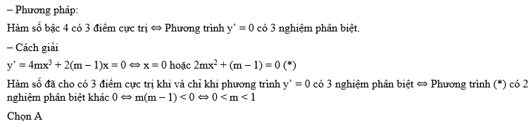Nhận biếtHàm số y = mx4 + (m – 1)x2 + 2m – 3 có 3 điểm cực trị khi và chỉ khi: