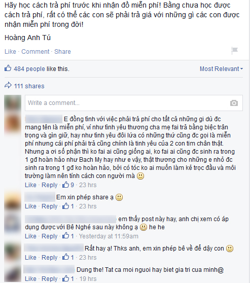 Bài viết của anh Chánh Văn đang được chia sẻ rất nhiều trên facebook và có những ý kiến khác nhau về bài học này.Bên cạnh đó, cũng có những ý kiến cho rằng số phận và hoàn cảnh của mỗi người mỗi khác và bài học trên dễ dàng áp dụng để dạy các bé lớn lên trong một gia đình đầy đủ điều kiện, nhưng với những ông bố bà mẹ có cuộc sống khó khăn hơn thì môi trường đã ảnh hưởng đến tính cách và cách giáo dục con cái của họ, điều này sẽ khó thực hiện.Có người lại tỏ ra băn khoăn bởi nếu ai cũng được đóng đinh vào đầu tư tưởng không có gì miễn phí thì "đồ chơi, lòng tốt, tiền bạc biết cho ai bởi ai cũng học thuộc lòng, không có gì miễn phí cả nên sẽ không dám nhận". Theo Trí Thức Trẻ Copy link Link bài gốc Lấy link TIN CÙNG CHUYÊN MỤC Xem theo ngày - Ngày 1 2 3 4 5 6 7 8 9 10 11 12 13 14 15 16 17 18 19 20 21 22 23 24 25 26 27 28 29 30 31