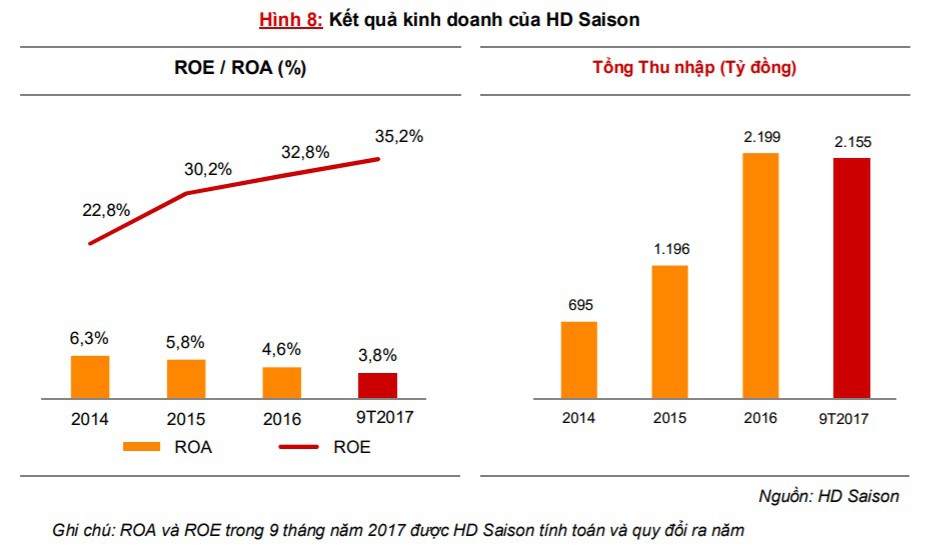 Ngoài ra, HD Saison đã cải thiện đáng kể tỷ suất lợi nhuận trên vốn chủ sở hữu (ROE) từ 30,2% trong năm 2015 lên 32,8% trong năm 2016 nhờ kiểm soát tốt tỷ lệ nợ xấu chỉ ở mức 5,2% - thấp nhất trong nhóm các công ty tài chính. Nợ xấu được kiểm soát tốt nhờ phân chia danh mục hợp lý, bao gồm 39,8% cho vay xe máy; 26,1% cho vay thiết bị gia dụng; 31,2% cho vay tiền mặt và 2,8% cho vay các sản phẩm mới khác như xe tải và giáo dục. Riêng các khoản vay bằng tiền mặt, HD Saison chỉ cho vay tiền mặt đối với khách hàng hiện tại có hồ sơ tín dụng đã được chứng minh có lịch sử trả nợ tốt.
