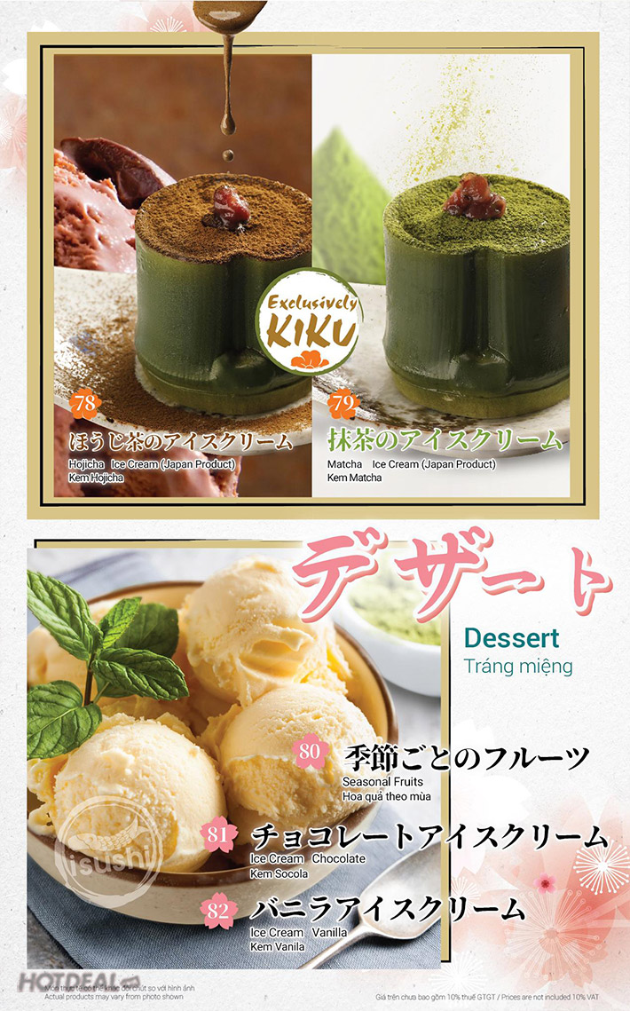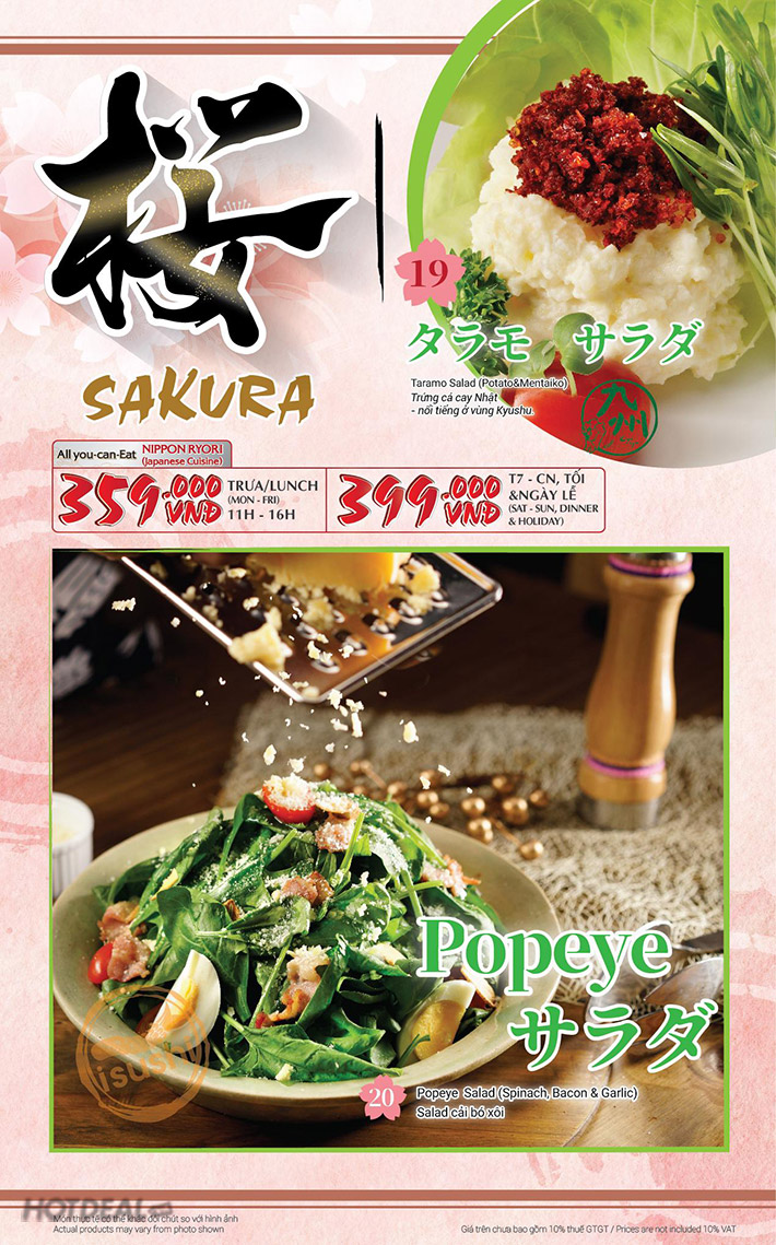 - Áp dụng cho: Buffet Sakura trưa & tối hội tụ tinh hoa Nhật Bản hơn 100 món nướng, lẩu, sushi, sashimi tươi tại Hệ thống nhà hàng cao cấp iSushi do Tổng bếp trưởng Noda Toshiro thực hiện. Tham khảo menu tại đây.