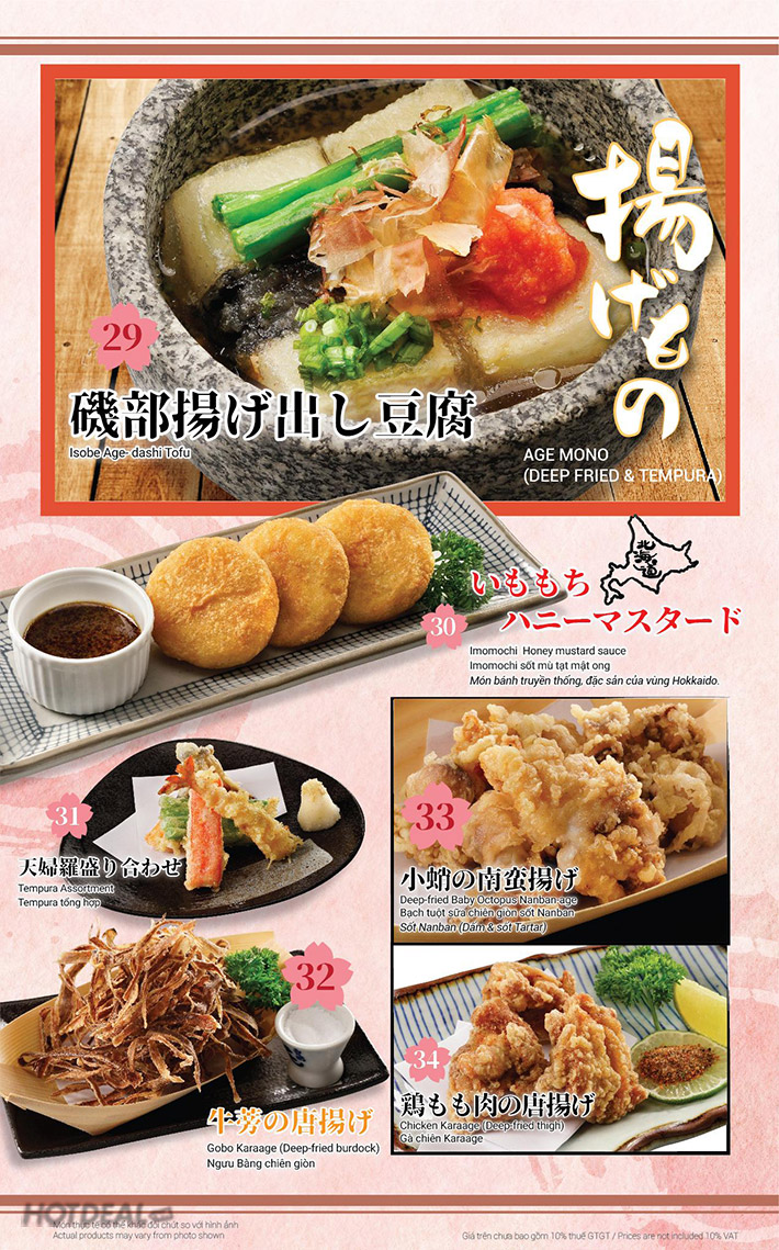 Lựa chọn tiếp theo trong thực đơn buffet là các món chiên, áp chảo thơm ngon tăng thêm khẩu vị cho bữa tiệc buffet mà không sợ ngấy như: thịt bò sốt tiêu đen, gà chiên kara age, mực kara age, tôm cuộn thịt heo xông khói... Bên cạnh đó, thực khách còn được thưởng thức nghệ thuật Teppanyaki độc đáo của Nhật với các món: Bò lúc lắc, món nướng tổng hợp, salad Popeye, cá hồi sốt teriyaki hay Isobe Age-dashi Tofu,... Ngoài ra, những món mì truyền thống Nhật Bản cũng đang chờ đợi bạn nếm thử: mì Kitsune udon, mì Karaage Ramen,…