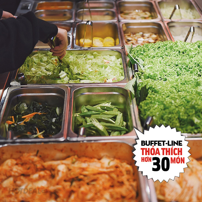 Buffet line với hơn 30 món sẽ thêm thỏa mãn thực khách bởi sự đa dạng và thơm ngon của các món ăn. Salad rau củ tươi xanh cùng các loại panchan đặc trưng xứ Hàn như salad rong biển, kim chi, giá đỗ… giúp kích thích và cân bằng vị giác tuyệt vời cùng với lượng thịt nướng được nạp vào.