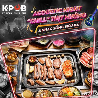- Thỏa thích thưởng thức thịt nướng, chill cùng âm nhạc với Đêm nhạc Accoustic diễn ra tối thứ 6 hàng tuần tại K-Pub. Không phụ thu.