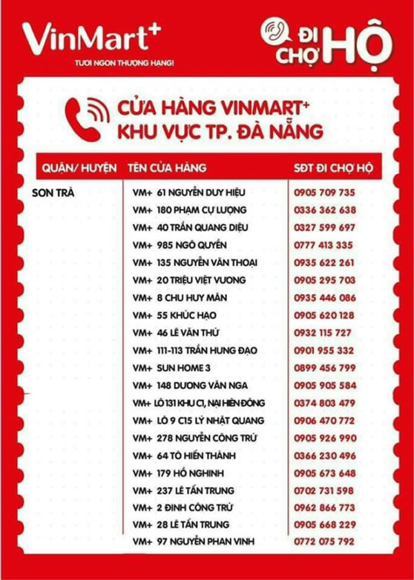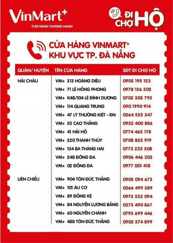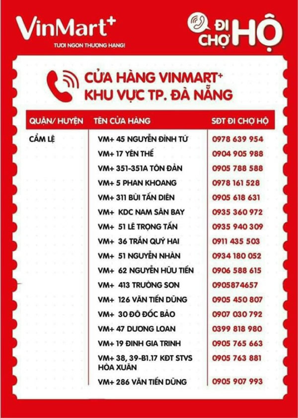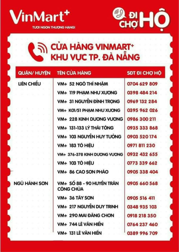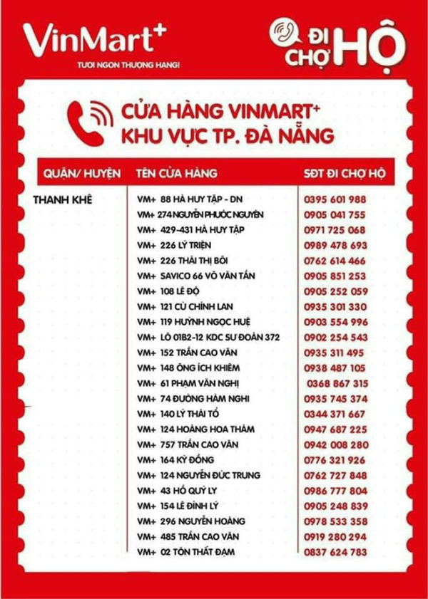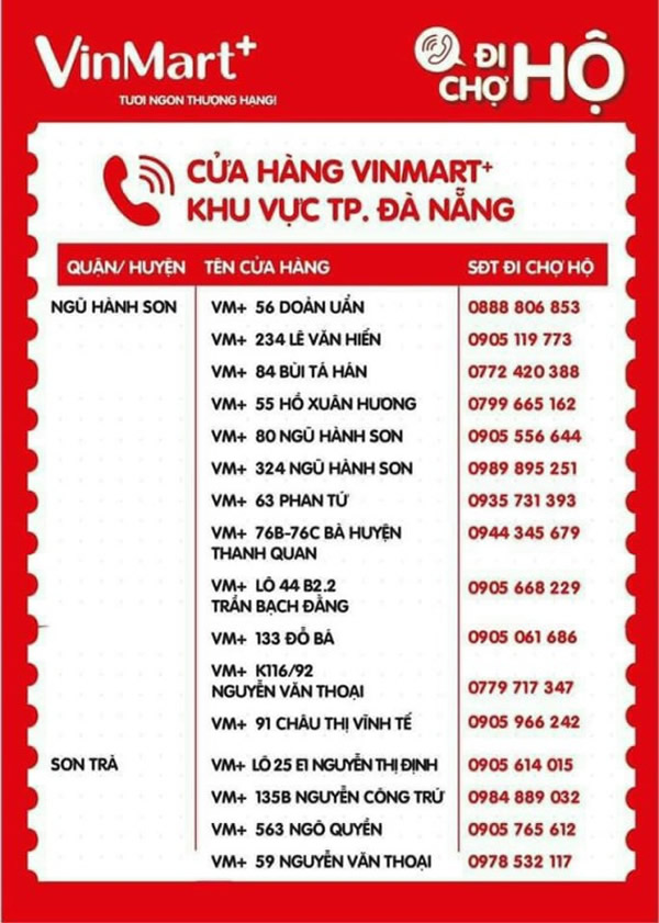 Do thực hiện chủ trương phong tỏa “cứng” toàn TP Đà Nẵng trong 7 ngày từ 8 giờ ngày 16-8 đến 8 giờ ngày 23-8 để phòng, chống dịch Covid-19 nên người dân không được phép ra đường để mua sắm các mặt hàng tiêu dùng thiết yếu hàng ngày. Nhằm góp phần thực hiện phương án do UBND TP ban hành về việc cung ứng hàng hóa thiết yếu cho người dân TP trong thời gian phong tỏa “cứng”, Hệ thống siêu thị Vinmart + trên địa bàn TP Đà Nẵng đã triển khai Chương trình “Đi chợ hộ”. Dưới đây là danh sách, địa chỉ và số điện thoại của các siêu thị Vinmart + trên địa bàn TP Đà Nẵng để các ban điều hành khu dân cư, khu chung cư, tổ, thôn trên địa bàn TP có thể liên lạc, kết nối nhằm tổ chức cung ứng hàng hóa thiết yếu cho các hộ dân trong thời gian phong tỏa “cứng”. Việc cung ứng hàng hóa thiết yếu của Hệ thống siêu thị Vinmart + phải tuân thủ nghiêm túc các quy định phòng chống dịch Covid-19 cũng như Phương án cung ứng, phân phối lương thực, thực phẩm và các mặt hàng thiết yếu phục vụ nhân dân tại Quyết định số 5264/UBND-SCT ngày 15-8 của UBND TP Đà Nẵng.