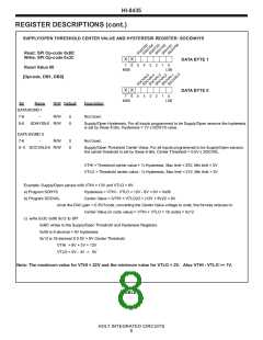 HI-8435 REGISTER DESCRIPTIONS (cont.) SUPPLY/OPEN THRESHOLD CENTER VALUE AND HYSTERESIS REGISTER: SOCENHYS Read: SPI Op-code 0xBC Write: SPI Op-code 0x3C Reset Value 00 SOHYSSO5HYSSO4HYSSO3HYSO2HYSSO1HYS0 X X DATA BYTE 1 DATA BYTE 0 7 6 5 4 3 2 1 0 MSB LSB [Opcode, DB1, DB0] AL0 AL5 AL4AL3 AL2AL1 SOCVSOCVSOCVSOCVSOCVSOCV X X 7 6 5 4 3 2 1 0 MSB LSB Bit Name R/W Default Description Not Used. DATAWORD 1 7-6 5-0 - R/W 0 0 SOHYS5-0 R/W Supply/Open Hysteresis. For all inputs programmed to be Supply/Open sensors the hysteresis is set by these 6 bits. Hysteresis = 1V x SOHYS value. DATA WORD 0 7-6 5- 0SOCVAL5-0 R/W - R/W 0 0 Not Used. Supply/Open Threshold Center Value. For all inputs programmed to be Supply/Open sensors the center threshold is set by these 6 bits. Center Threshold = 0.5V x SOCVAL. VTHI = Threshold center value + ½ Hysteresis, Max limit = 22V, Min limit = 3V VTLO = Threshold center value - ½ Hysteresis, Max limit = 21V, Min limit = 2V Example: Supply/Open sensor with VTHI = 12V and VTLO = 6V: a) Program SOHYS b) Program SOCVAL Hysteresis = VTHI - VTLO = 12V - 6V = 6V = 0x06 Center Value = (VTHI + VTLO)/2 = (12V + 6V)/2 = 9V since the DAC gain = 0.5V/1code, converting the Center Value voltage to code, the formula reduces to: Center Value (in code value) = VTHI + VTLO = 18 codes = 0x12 c) write0x3C 0x06 0x12 to SPI 0xBC writes to the Supply/Open Threshold and Hysteresis Registers. 0x06 is 6 decimal = 6V Hysteresis. 0x12 is 18 decimal X 0.5V = 9V Center Threshold. VTHI =9V + 3V = 12V VTLO = 9V - 3V= 6V Note: The maximum value for VTHI = 22V and the minimum value for VTLO = 2V.Also VTHI - VTLO >= 1V. TABLE 7. HOLT INTEGRATED CIRCUITS 8