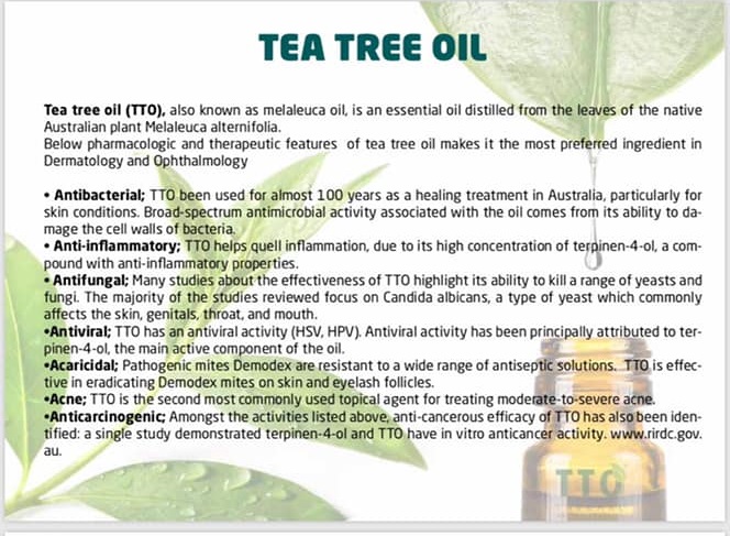 Tại sao nên sử dụng Blefari TTO trong điều trị viêm bờ mi ? Bởi trong thành phần bộ 3 sản phẩm Blefari TTO có chứa tinh dầu cây tràm trà. Trong bệnh lý viêm bờ mi nguyên nhân chủ yếu gây bệnh thường do vi khuẩn, virus, nấm và demodex. TTO là một chất kháng khuẩn tự nhiên có thể diệt được các nguyên nhân gây bệnh viêm bờ mi. Ngoài ra trong bộ 3 sản phẩm TTO còn có các thành phần như tinh dầu Hắc Mai Biển, tinh dầu Ban Âu, Cúc La Mã, Vitamin B5 làm tăng khả năng chống viêm, diệt khuẩn. Blefari TTO không có chứa Cồn, Paraben chất tạo mùi thơm nên sử dụng an toàn cho trẻ nhỏ.