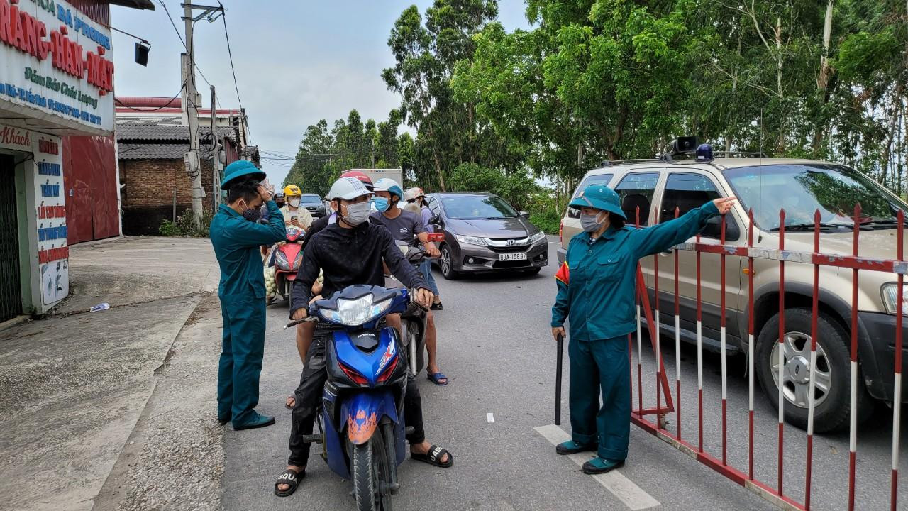 Chốt kiểm dịch ra vào thành phố Bắc Ninh. Mỗi chốt có sự tham gia của nhân viên y tế, quân đội, công an, dân quân tự