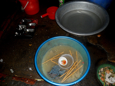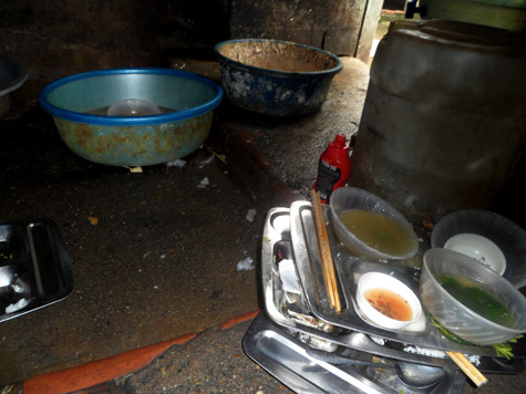 Bát đĩa của khách sau khi ăn xong sẽ được đem đi rửa "sơ qua" và tất cả quy trình được thực hiện dưới sàn nhà nhầy nhụa này,...