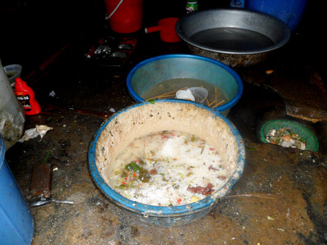 Nơi nấu nướng ẩm thấp, tối tăm, khói bụi, sỉ than bám đầy nồi niêu, xoong chảo. Các chậu rửa bát đũa bám dày váng mỡ......