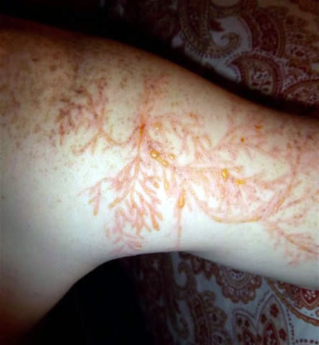 (Cadn.com.vn) - Cho đến nay nhiều người chưa biết bệnh Lightning Flowers –“Hoa sét đánh” này. Đây là căn bệnh lạ do sét đánh tạo ra những bông hoa giống như lông chim, cây dương xỉ hay cành nhánh tua tủa trên cơ thể người. Những người mắc phải căn bệnh này lại là những người may mắn sống sót và được mệnh danh là “người sét”.