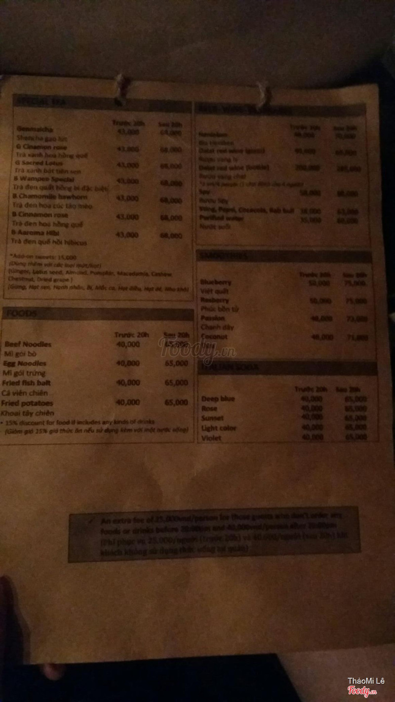 - Trung bình Viết bình luận Thông tin & Bản đồ Báo lỗi vị trí Thời gian hoạt động Đang mở cửa 07:30 - 23:00 Thích hợp Buổi sáng , Buổi trưa , Buổi xế , Buổi tối Giờ nhận khách cuối 10:30 PM Thời gian chuẩn bị Khoảng 5 - 10 phút Nghỉ lễ Các ngày lễ trong năm Thể loại Café/Dessert Sức chứa 60 người lớn Phong cách ẩm thực Món Việt Phù hợp với Hẹn hò , Họp nhóm , Tiếp khách , Hát hò , Thư giãn , Takeaway - Mang về , Nghe nhạc Phục vụ các món Café - Kem Giấy phép/chứng nhận Xem