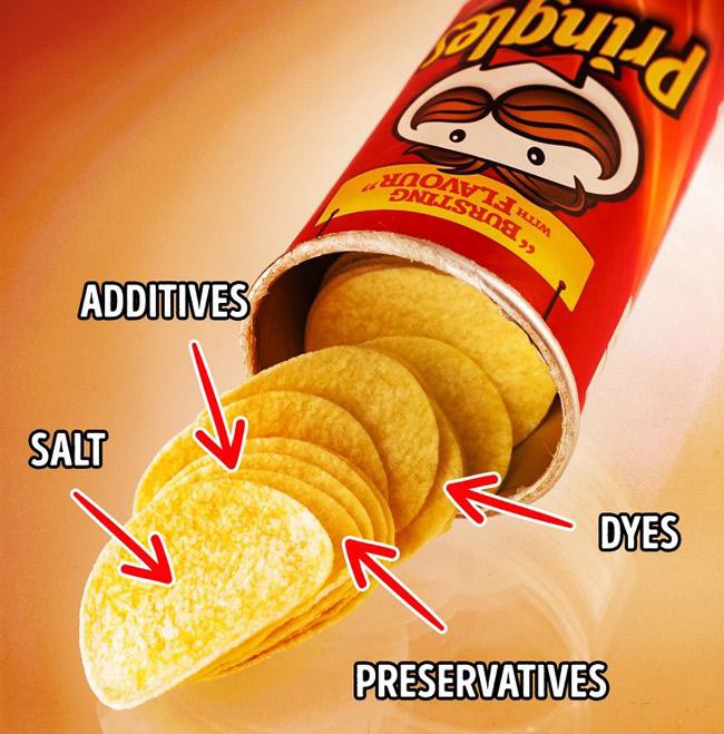 Hầu hết khoai tây chiên chúng ta mua ở siêu thị có rất ít thành phần thật sự là khoai tây và có nhiều chất phụ gia hơn chúng ta tưởng. Một số nghiên cứu đã chỉ ra rằng phần lớn các túi khoai tây chiên có thành phần khoai tây thật sự ít hơn 60%. Tuy nhiên nó lại có chứa rất nhiều muối, chất phụ gia, thuốc nhuộm và chất bảo quản. Tất nhiên những thành phần này nếu vào cơ thể sẽ gây hại tới sức khỏe.
