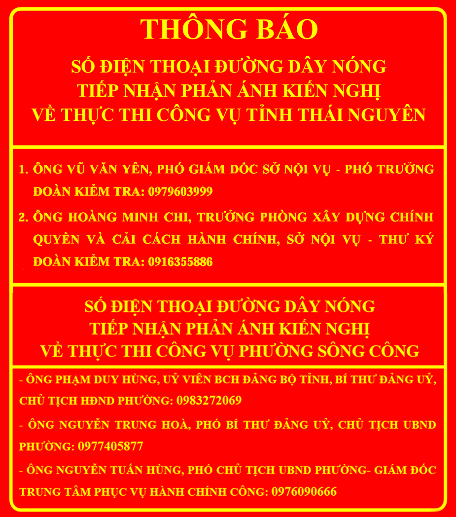 | TRANG THÔNG TIN ĐIỆN TỬ PHƯỜNG SÔNG CÔNG TỈNH THÁI NGUYÊN Cơ quan chủ quản: UBND PHƯỜNG SÔNG CÔNG Địa chỉ: Số 1, đường Trần Phú, Phường Sông CôngTrưởng Ban Biên tập: Email: [email protected] - Điện thoại: 0208 3 862 238, Fax: 0208 3 862 439 * Ghi rõ nguồn: Trang thông tin điện tử phường Sông Công "https://songcong.thainguyen.gov.vn" khi phát hành lại thông tin từ website này |