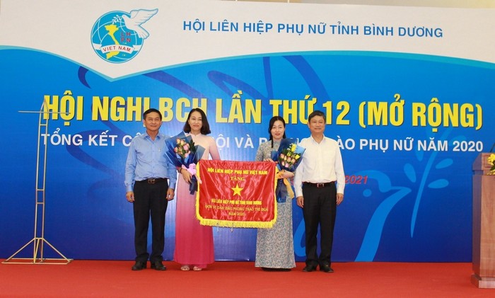 Lãnh đạo tỉnh trao cờ thi đua của Trung ương Hội LHPN Việt Nam cho Ban Thường vụ Hội LHPN tỉnh Báo cáo tại Hội nghị đánh giá, năm 2020, tình hình dịch bệnh Covid – 19, hạn mặn và các đợt bão, lũ lụt diễn biến phức tạp đã ảnh hưởng trực tiếp, tạo ra những khó khăn, thách thức không nhỏ cho các cấp Hội LHPN tỉnh Bình Dương trong triển khai, tổ chức thực hiện các chỉ tiêu, nhiệm vụ theo kế hoạch năm 2020.