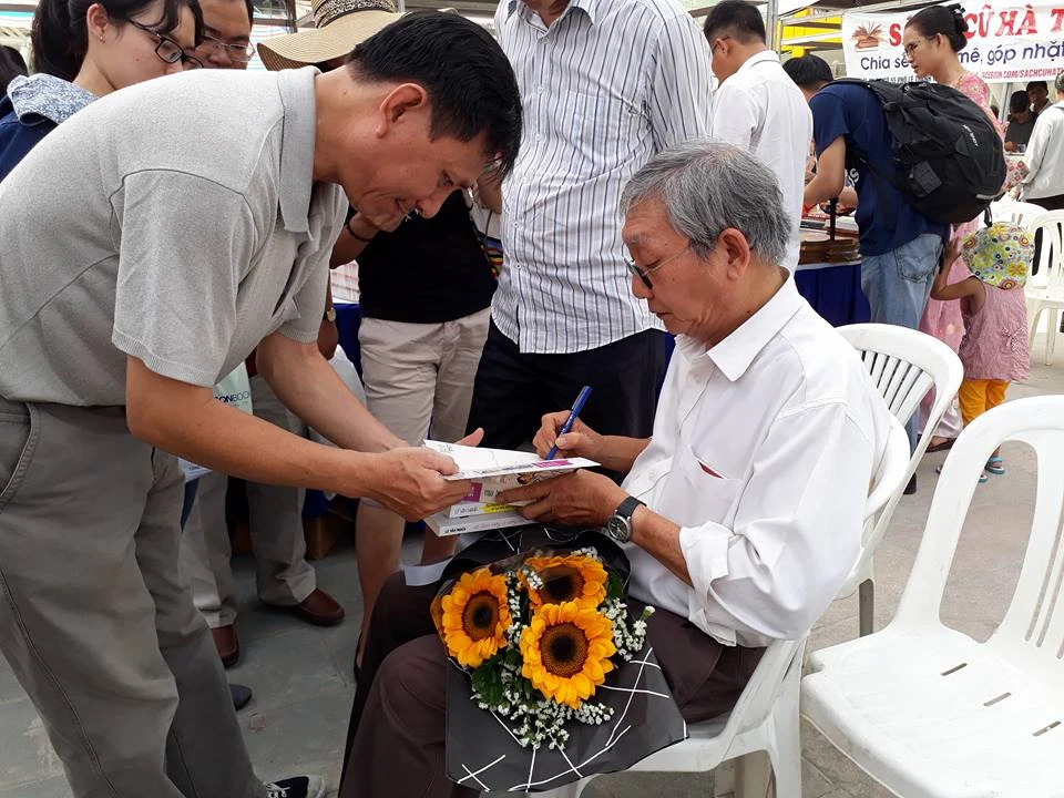 Nhà văn Lê Văn Nghĩa ký tặng bạn đọc.